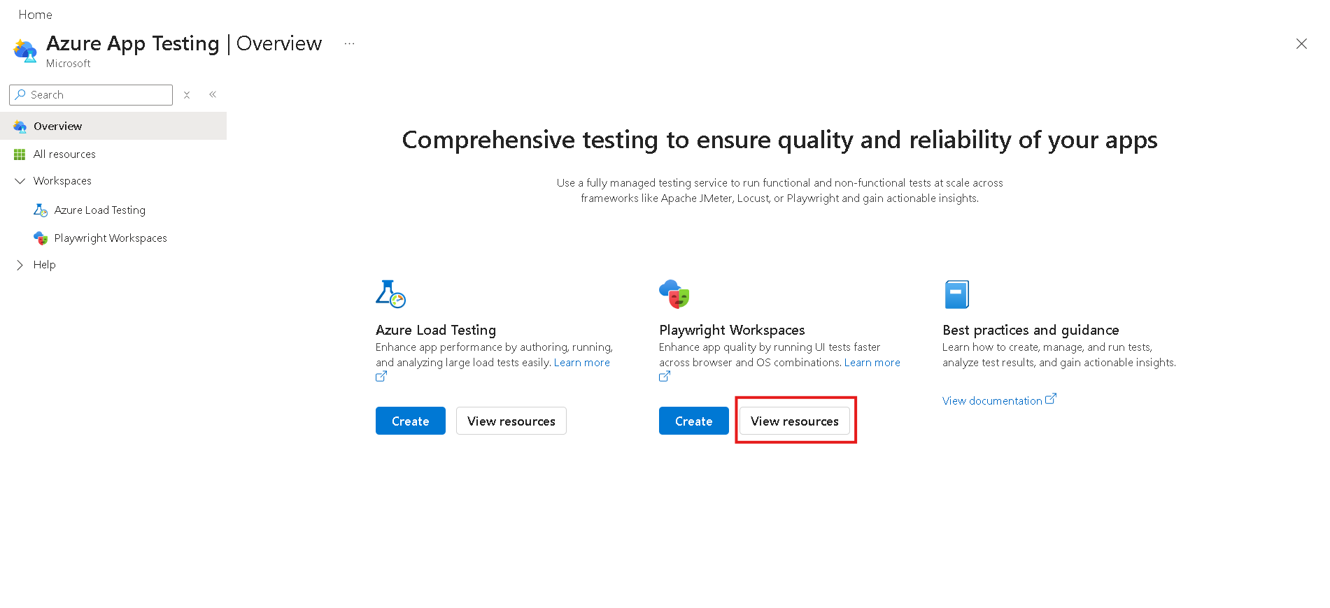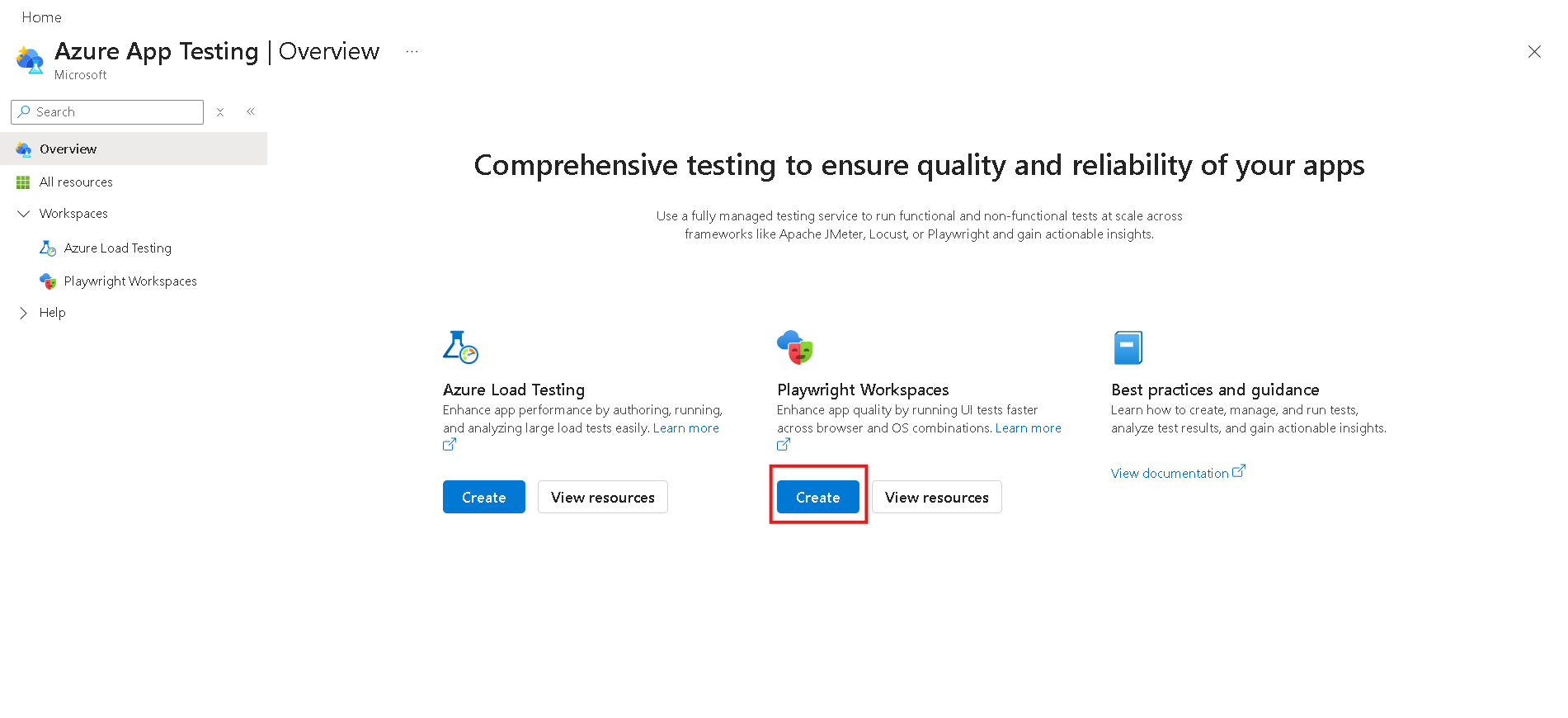Az Azure App Testing Hubon válassza a Létrehozás lehetőséget a Playwright-munkaterületek alatt