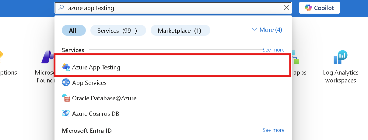 A portál kezdőlapján keresse meg és válassza az Azure App Testing lehetőséget.