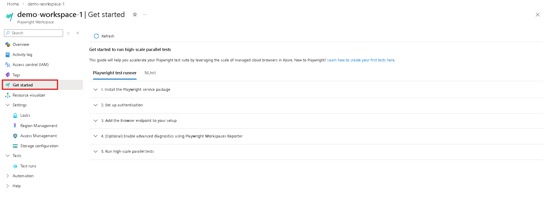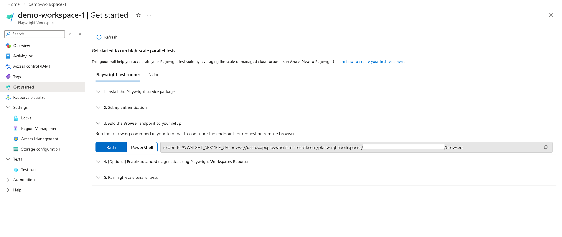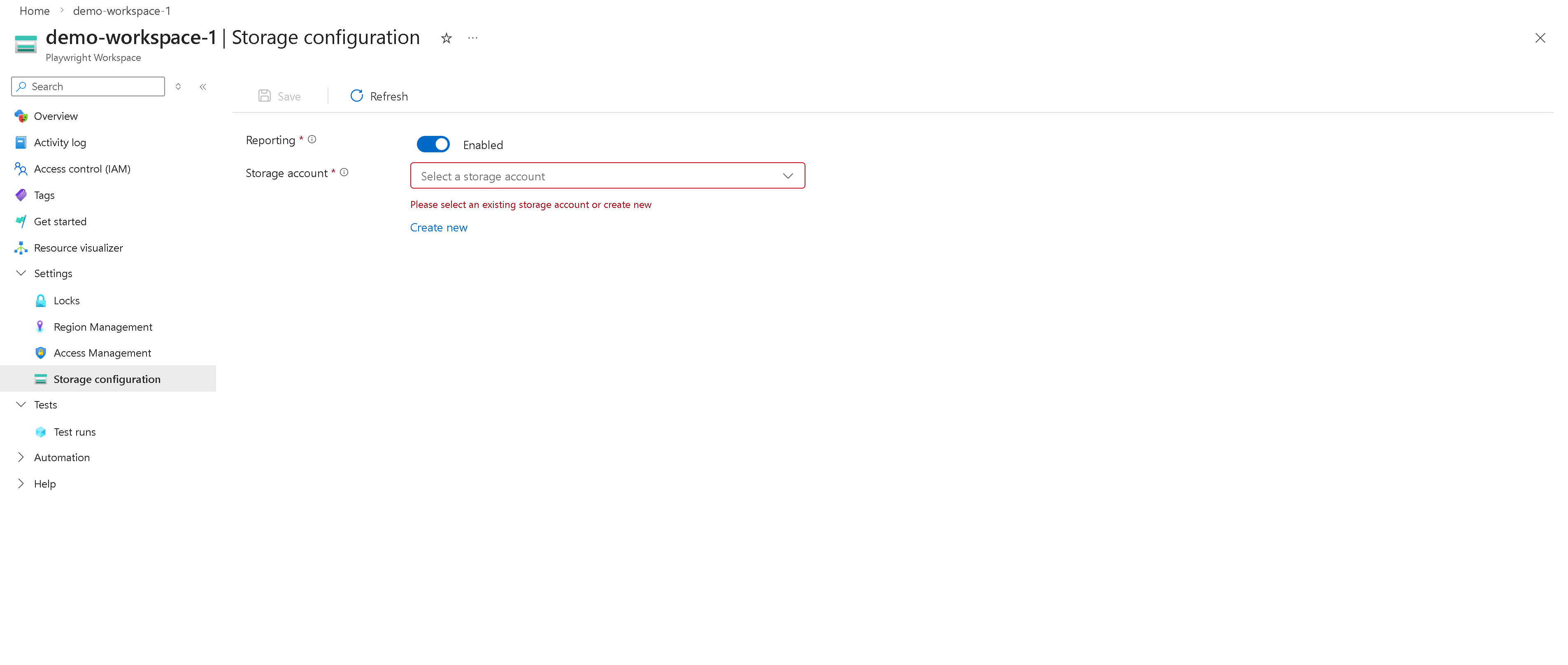 A Playwright-munkaterületek jelentéskészítésének első lépése a jelentéskészítés engedélyezése a munkaterületen, és egy tárfiók összekapcsolása a jelentéskészítési összetevők tárolásához. Első lépésként használhatja az új munkaterületet, vagy használhatja a meglévő munkaterületet.