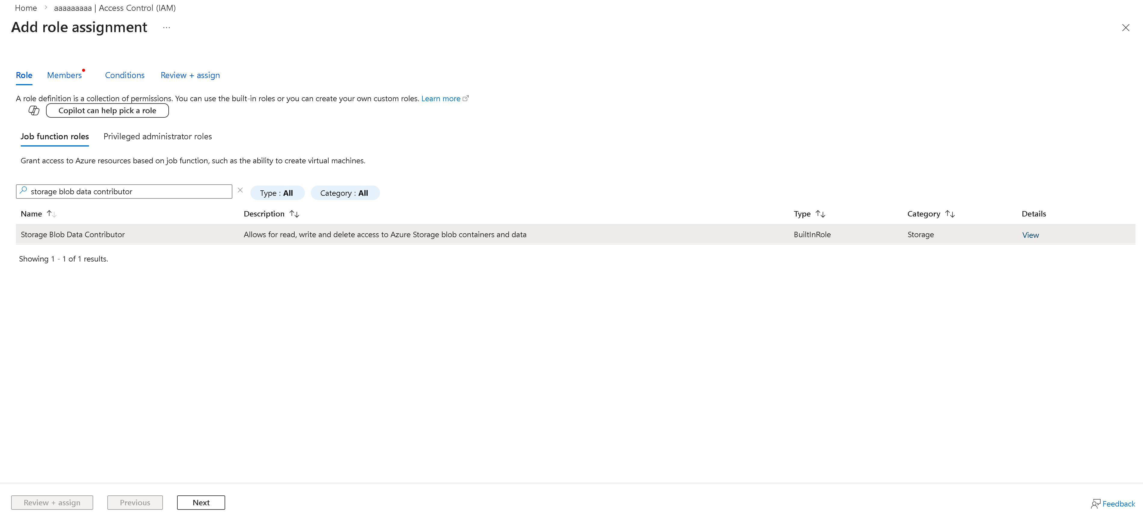 A Feladatfüggvény-szerepkörök csoportban keresse meg és válassza a Storage Blob Data Közreműködő szerepkört, és kattintson a Tovább gombra.