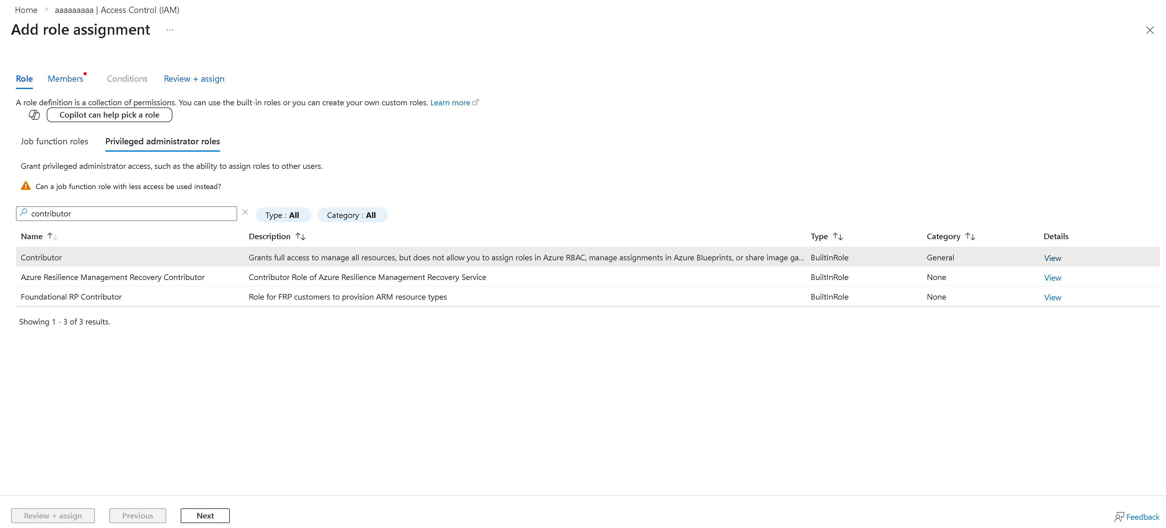 A Kiemelt rendszergazdai szerepkörök csoportban keresse meg és válassza ki a Közreműködő* szerepkört, majd kattintson a Tovább gombra.