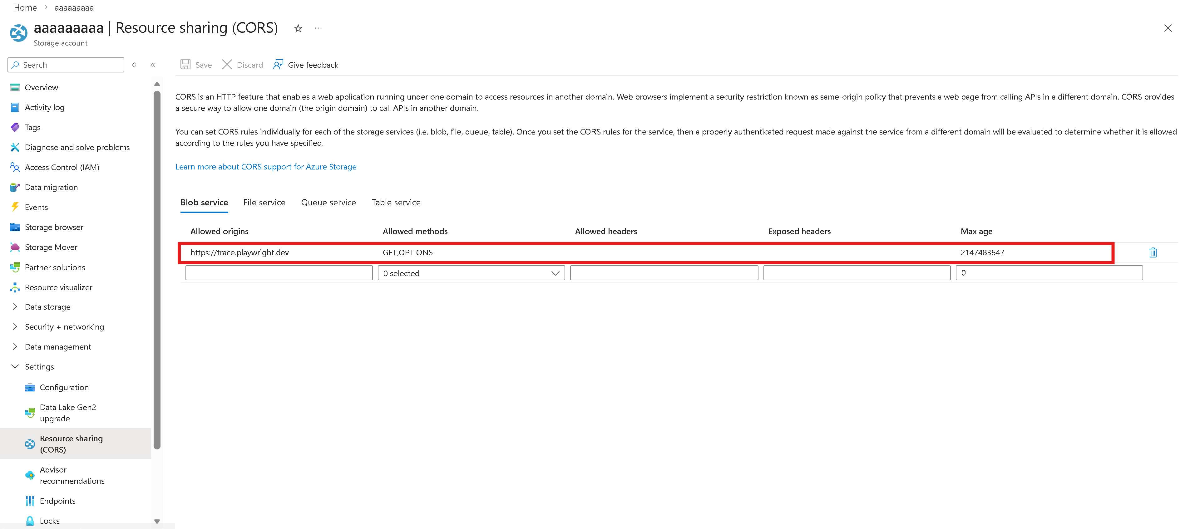Válassza a Beállítások –> Erőforrás-megosztás (CORS) lehetőséget.