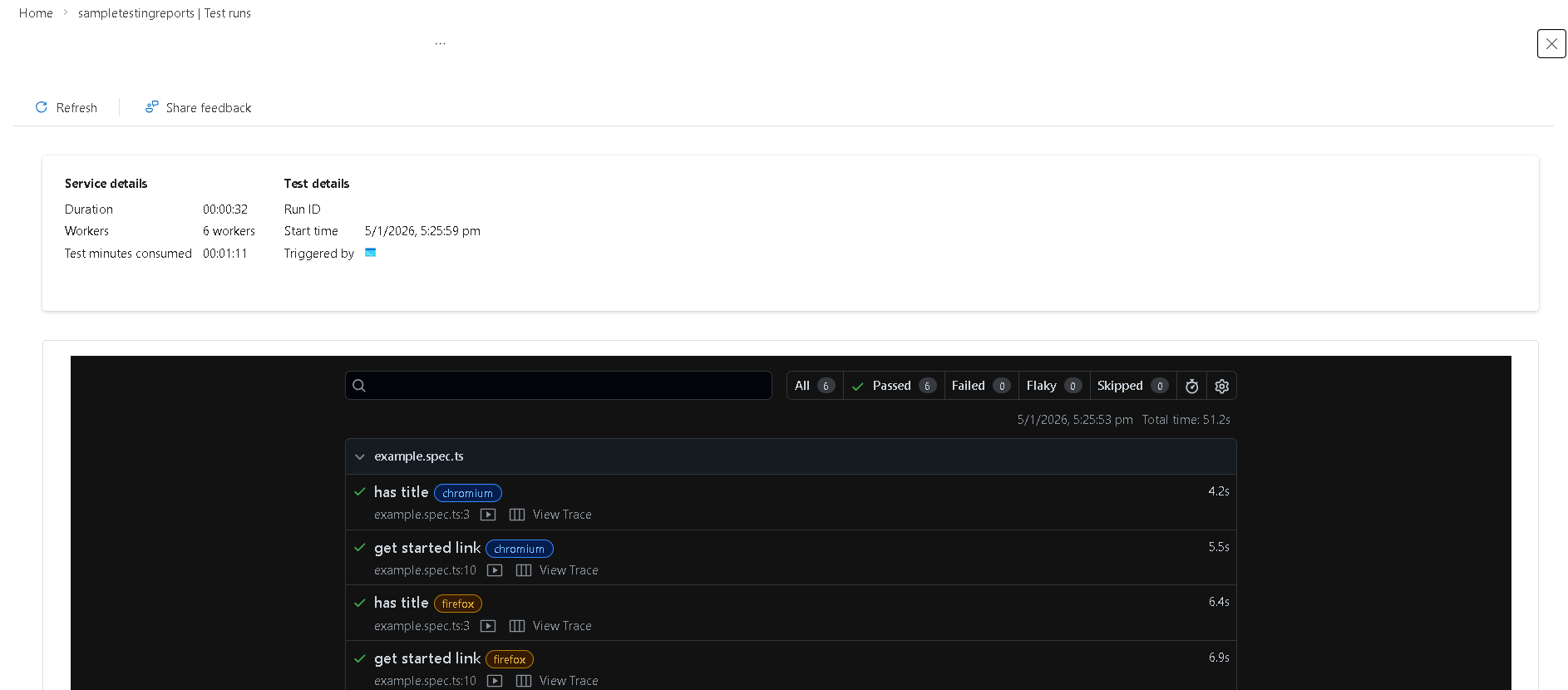 A tesztfuttatás befejezése után a riporter létrehoz egy hivatkozást az Azure PortalTesztfuttatások lapjára. Nyissa meg ezt a hivatkozást a részletes teszteredmények és a kapcsolódó összetevők megtekintéséhez.