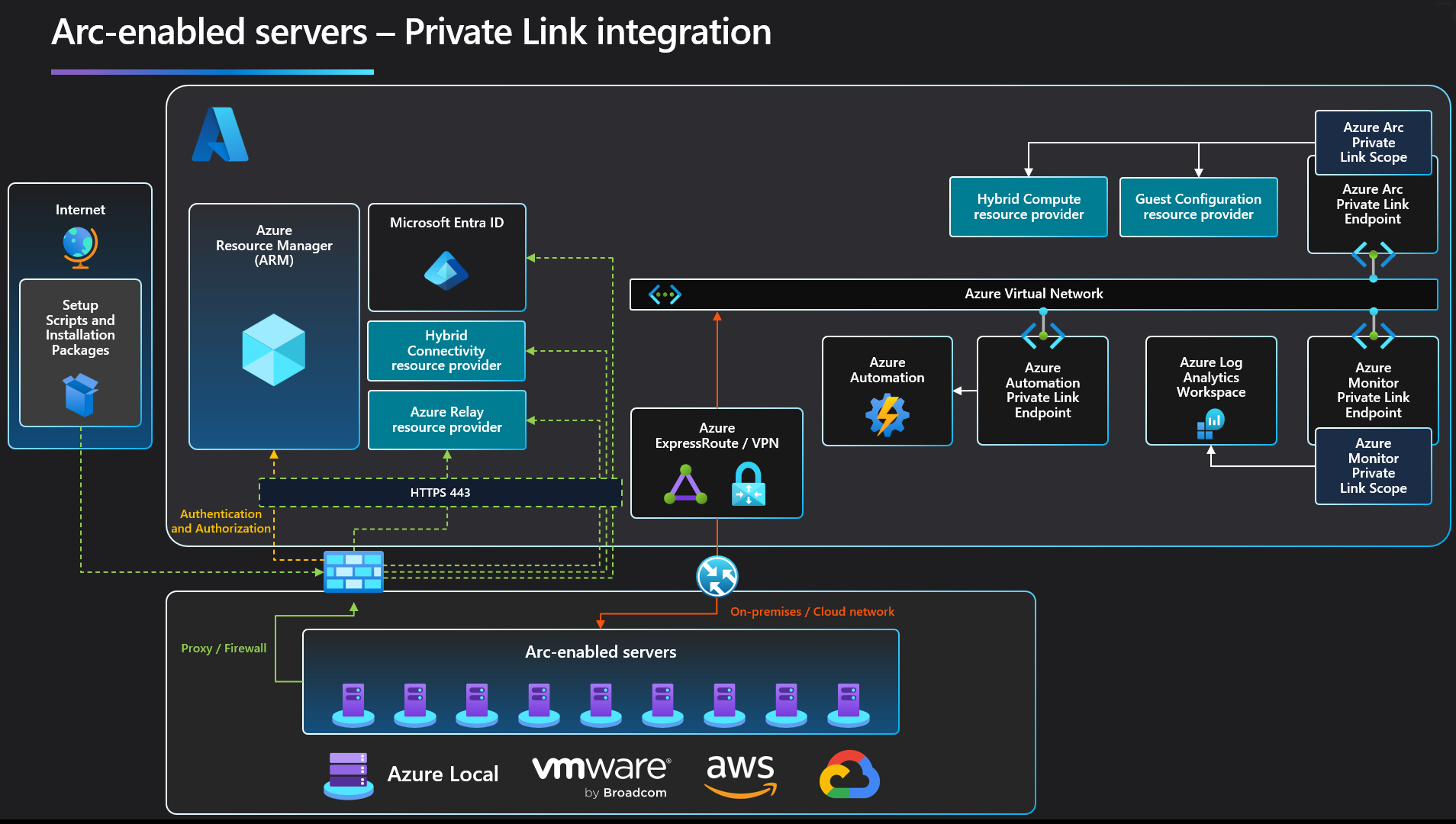 Az Azure Arc-kompatibilis kiszolgálók több Azure-szolgáltatással integrálhatók, így felhőfelügyeletet és szabályozást hozhatnak a hibrid gépekre vagy kiszolgálókra. A szolgáltatások többsége már kínál privát végpontokat. Konfigurálnia kell a tűzfalat és az útválasztási szabályokat, hogy engedélyezze a Microsoft Entra-azonosítóhoz és a Resource Managerhez való hozzáférést az interneten keresztül, amíg ezek a szolgáltatások privát végpontokat nem biztosítanak.