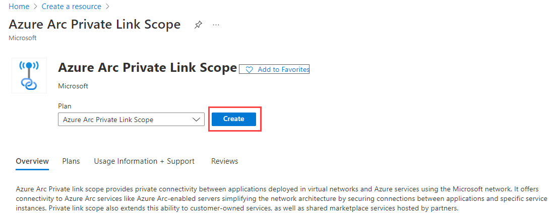 Másik lehetőségként lépjen közvetlenül az Azure Arc Private Link Scopes lapjára a portálon, majd válassza a Létrehozás lehetőséget.