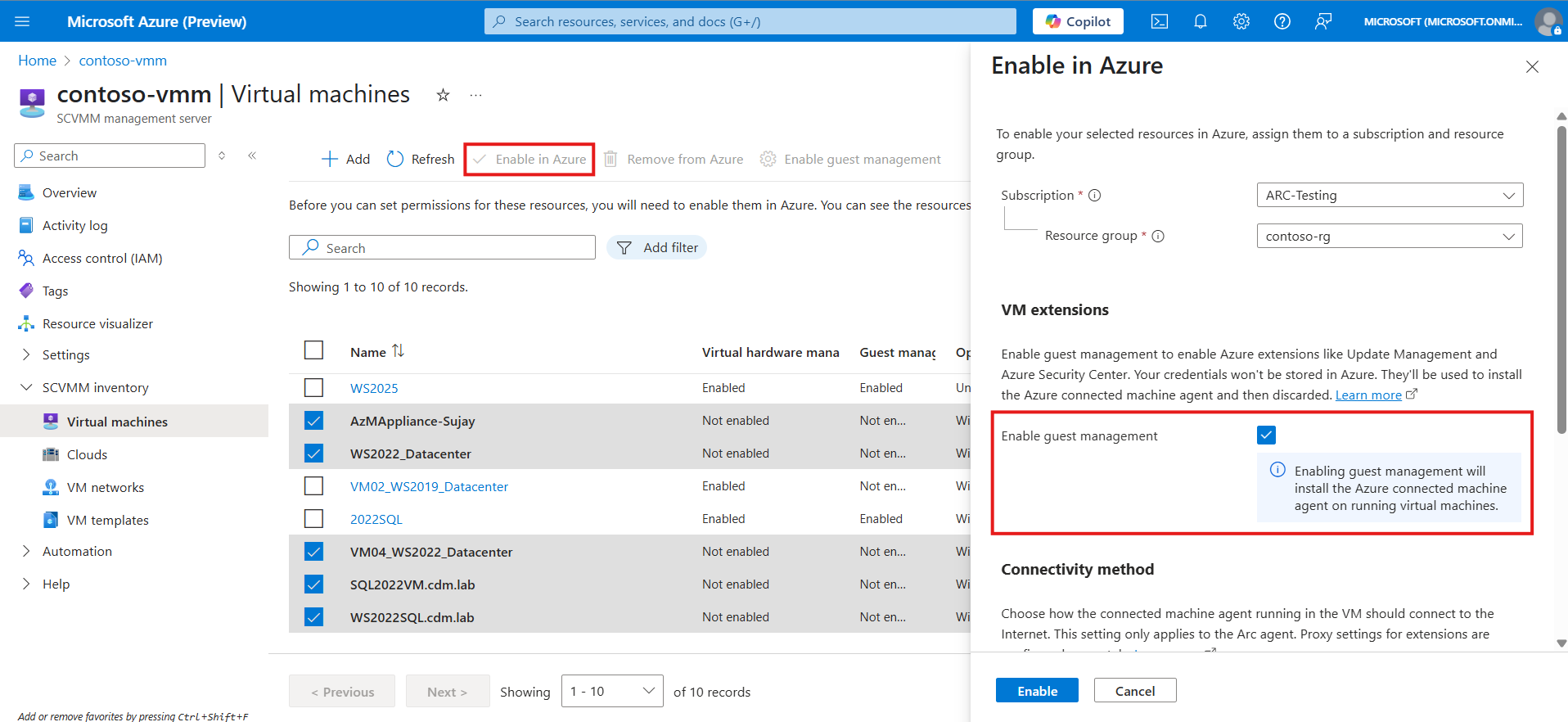 Jelölje ki a nagy léptékű Arcra előkészíteni kívánt gépeket, és válassza az Engedélyezés az Azure-ban lehetőséget.