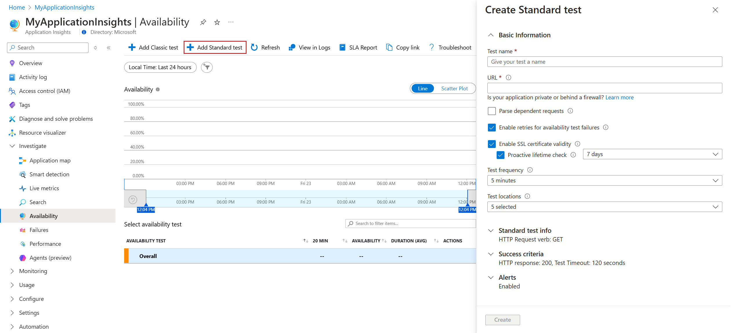 Nyissa meg az Application Insights-erőforrást, és nyissa meg a rendelkezésre állási felületet.