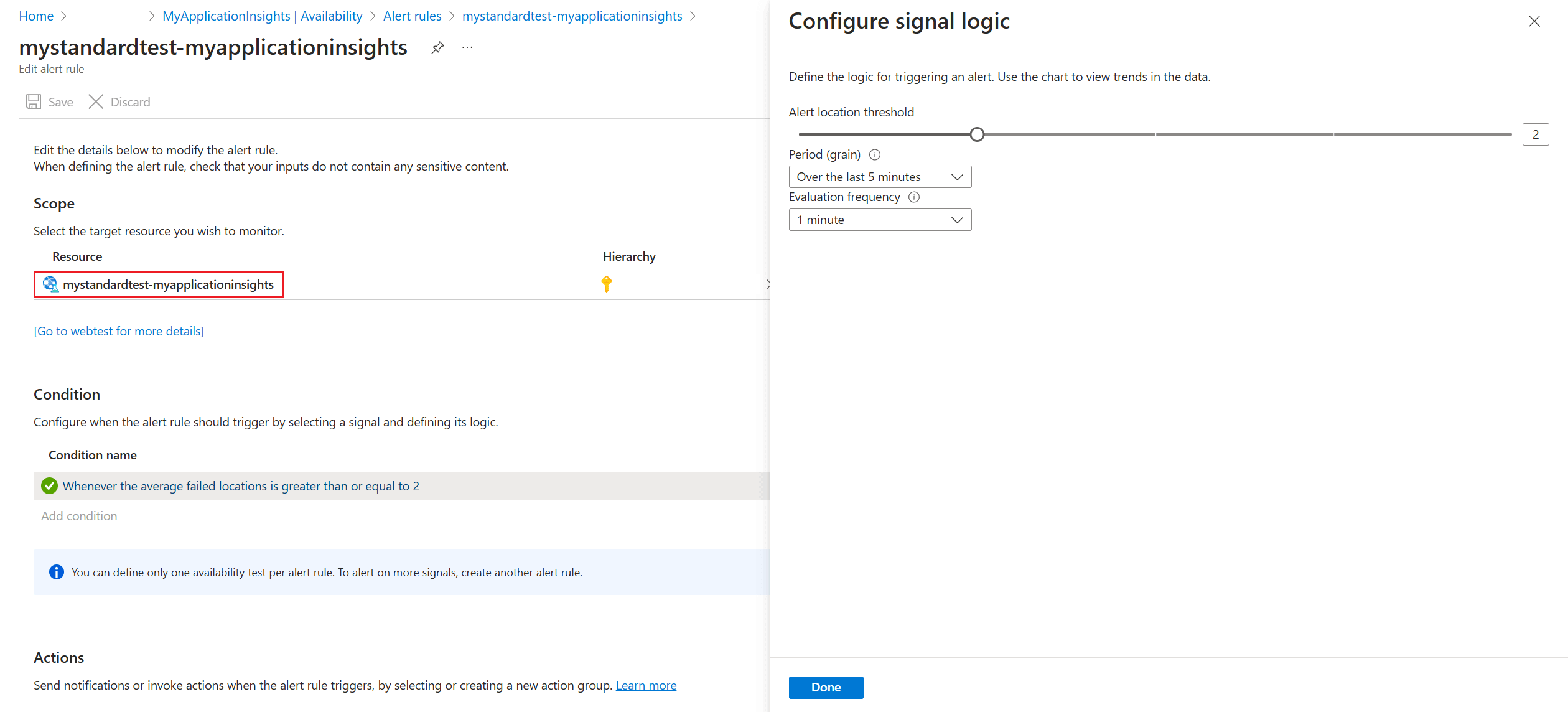 Failure ThresholdésOutage Window: Ezeket a paramétereket használhatja a szolgáltatáskimaradás saját feltételeinek meghatározásához. Ilyen például az Application Insights rendelkezésre állási riasztásának feltételei, amelyek egy kiválasztott időszak sikertelen helyszámlálói alapján vannak megadva. A tipikus küszöbérték három hely egy ötperces időkeretben. -