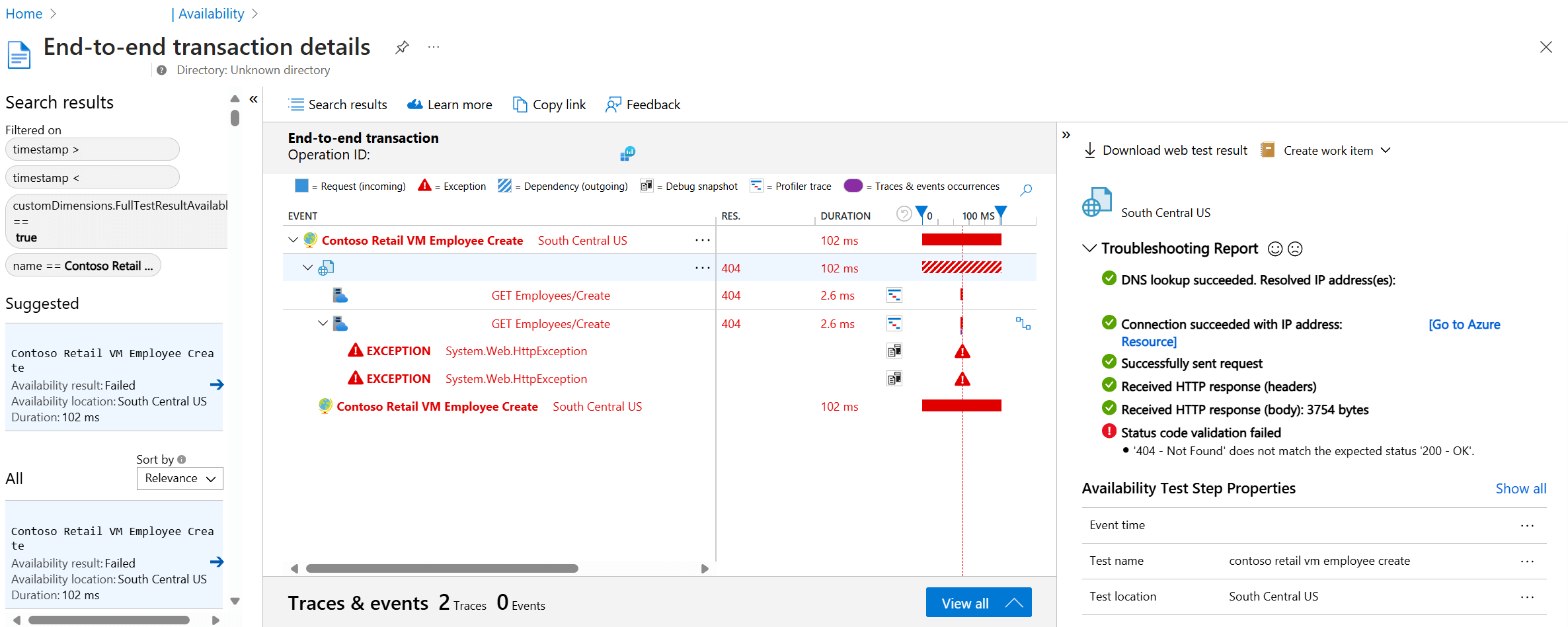 Válassza ki a kivételsort annak a kiszolgálóoldali kivételnek a részleteinek megtekintéséhez, amely miatt a szintetikus rendelkezésre állási teszt meghiúsult. A hibakeresési pillanatképet a kódszintű diagnosztikához is beszerezheti.