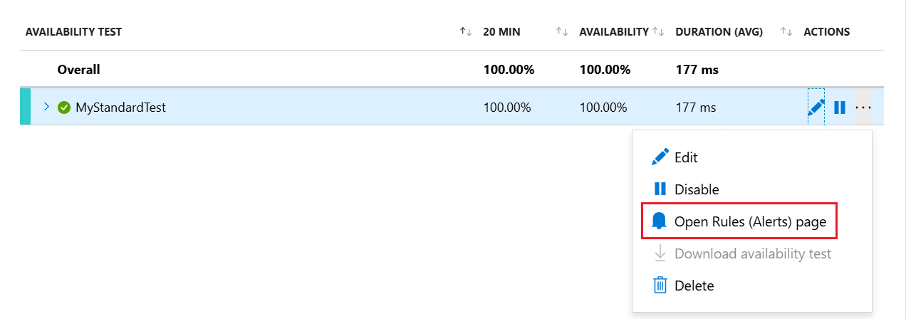 A rendelkezésre állási teszt mentése után nyissa meg a helyi menüt az elvégzett teszt alapján, majd válassza a Szabályok (riasztások) lap megnyitása lehetőséget.