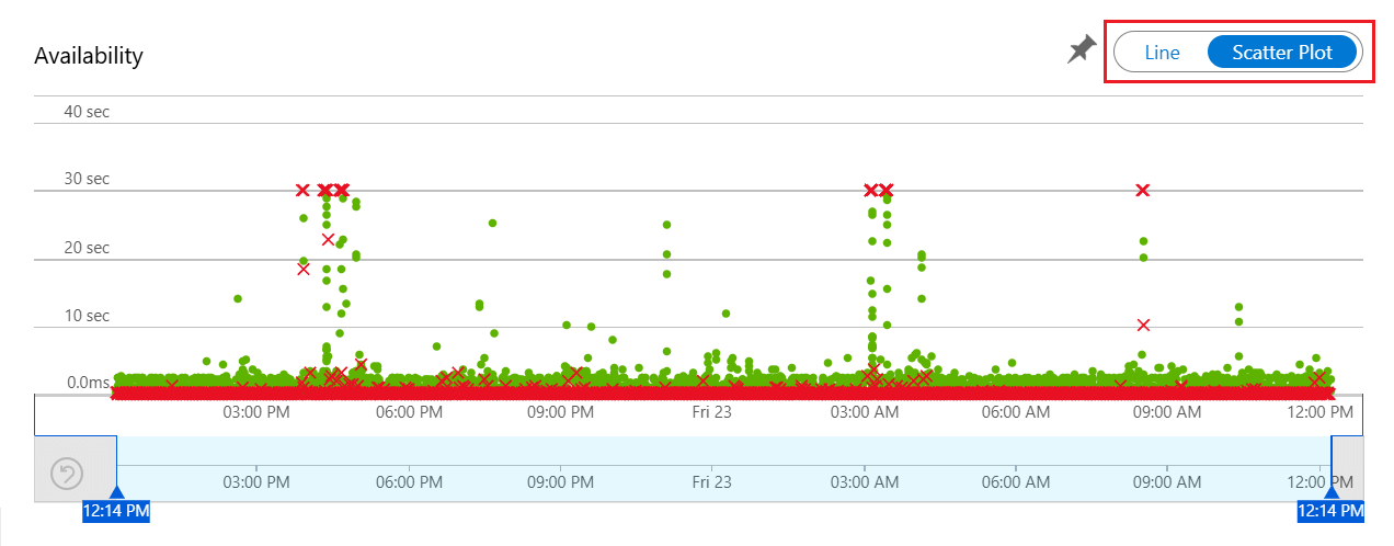Alapértelmezés szerint a Rendelkezésre állási felület egy vonaldiagramot jelenít meg. Módosítsa a nézetet pontdiagramra (kapcsolja a gráf feletti váltógombot) a diagnosztikai tesztlépések részleteivel rendelkező teszteredmények mintáinak megtekintéséhez. A tesztmotor tárolja a hibákat tartalmazó tesztek diagnosztikai adatait. A sikeres tesztek esetében a végrehajtások részhalmazainak diagnosztikai adatait is tárolja. A teszt, a teszt neve és a hely megtekintéséhez mutasson bármelyik zöld pontra vagy piros keresztre.