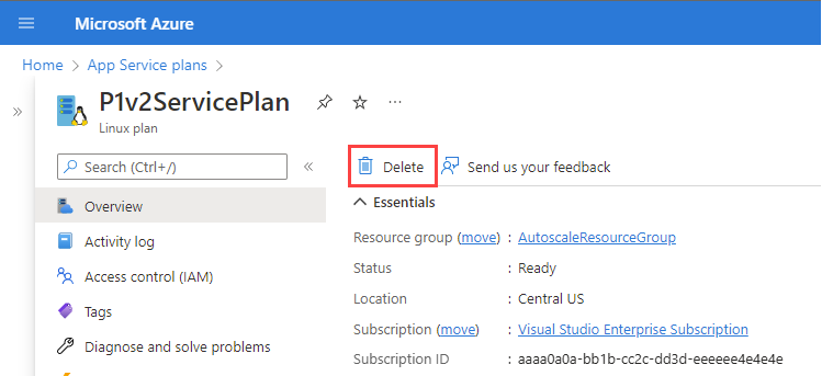 Az App Service áttekintési lapján válassza a Törlés lehetőséget.