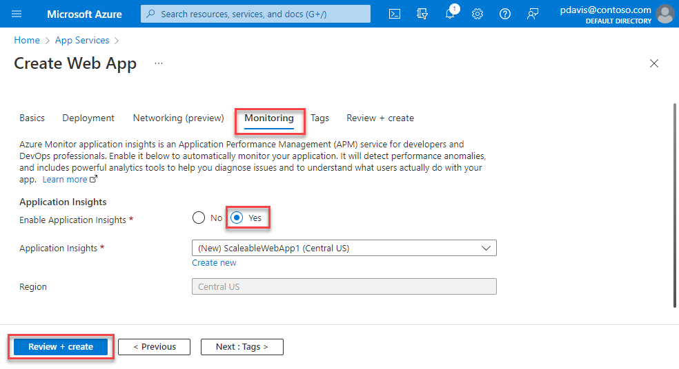 A Figyelés lapon válassza az Igen lehetőséget az Application Insights engedélyezéséhez.