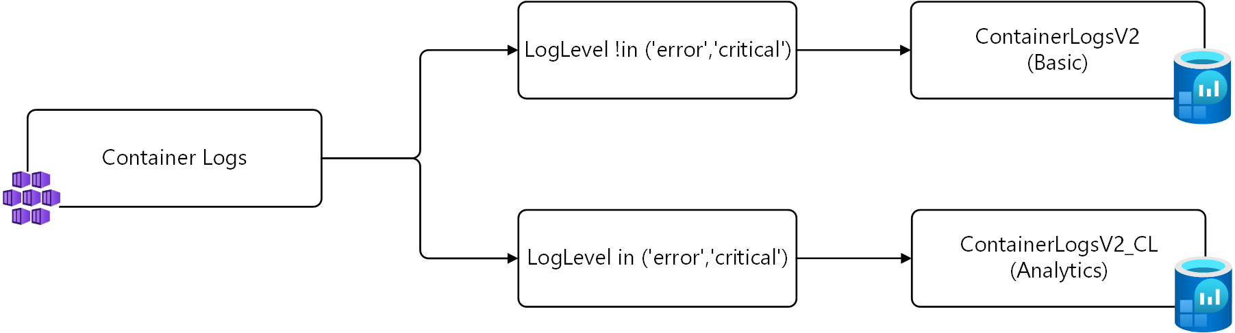 A fenti példában csak azok a rekordok gyűjtjük össze, amelyek LogLevel vagy error vagy critical állapotúak. Alternatív stratégia ahelyett, hogy egyáltalán nem gyűjtené ezeket a rekordokat, konfigurálja a ContainerLogV2-t az alapszintű naplókhoz, és küldje el ezeket a rekordokat egy másik táblába.