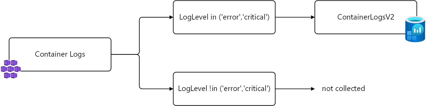 Az alábbi példa az ContainerLogV2 adatait szűri ki a LogLevel oszlop alapján. Csak olyan rekordokat gyűjtünk össze, amelyek rendelkeznek LogLevel, error vagy critical értékkel, mivel ezek azok a bejegyzések, amelyeket a problémafigyeléshez és a fürt problémáinak azonosításához használhat. Más szintek összegyűjtése és tárolása, például info és debug költségeket okoz jelentős érték nélkül.