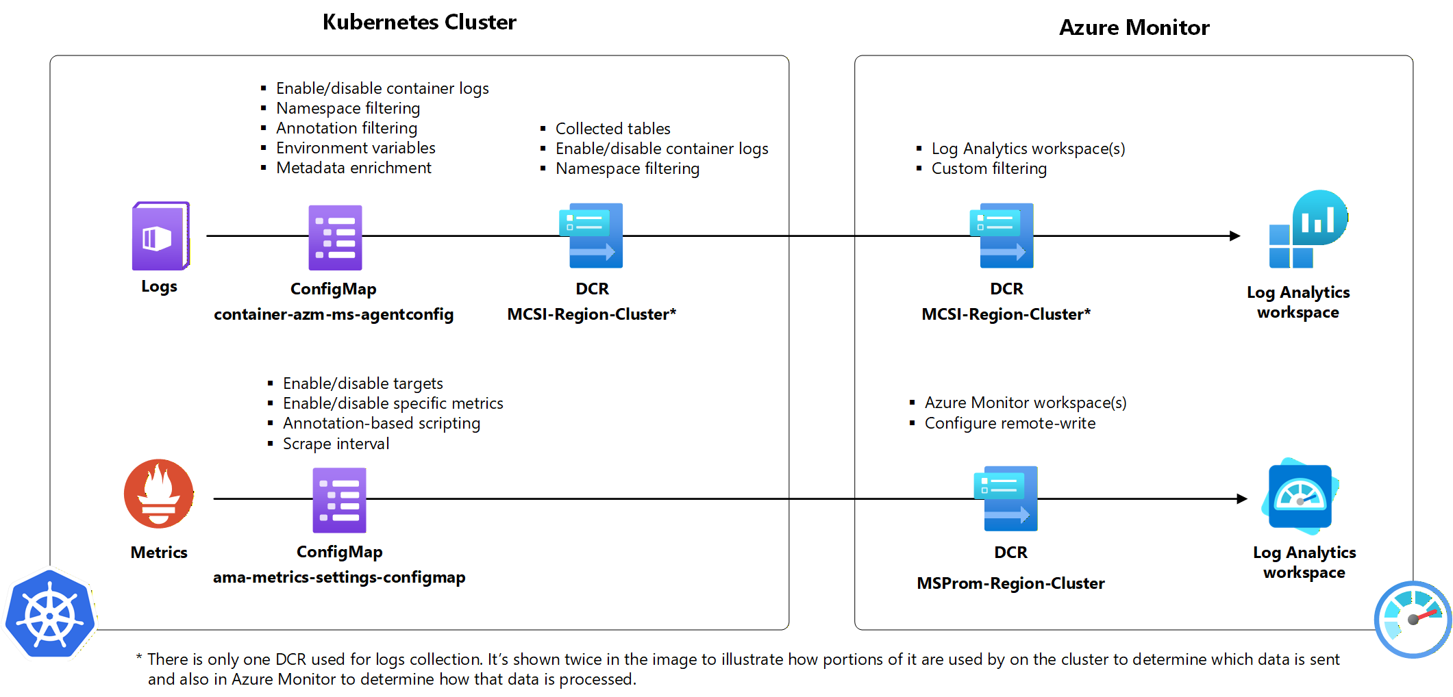 Az alábbi kép bemutatja, hogyan használják az egyes konfigurációs módszereket a Kubernetes-fürtökből származó adatok gyűjtésében. A naplók gyűjtéséhez csak egy DCR használható. Az látható a képen kétszer, hogy a DCR bizonyos információit az ügynök a fürt szintjén használja fel, míg az adatok kézbesítését követően a DCR többi információit az Azure Monitor használja.