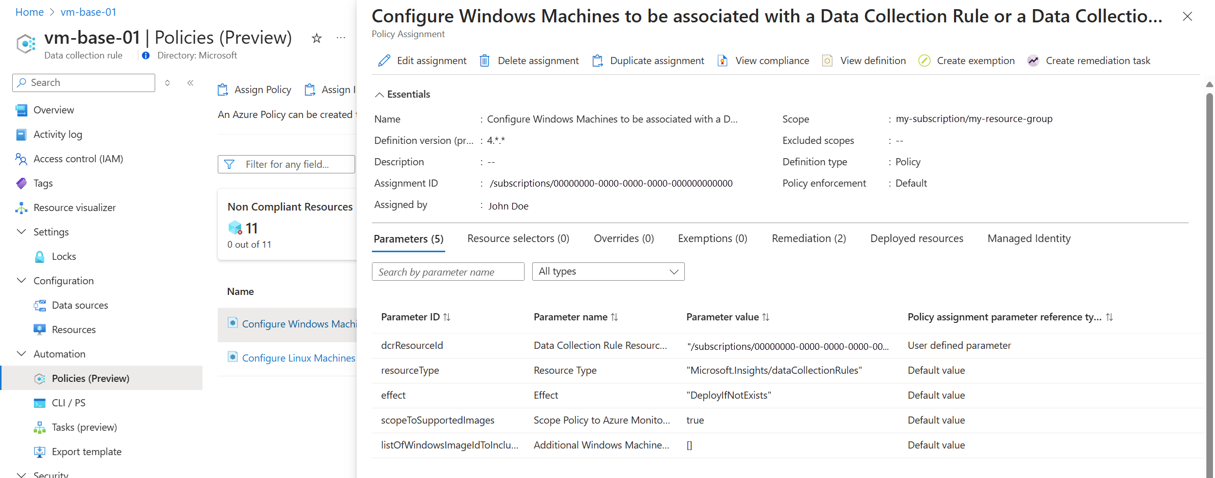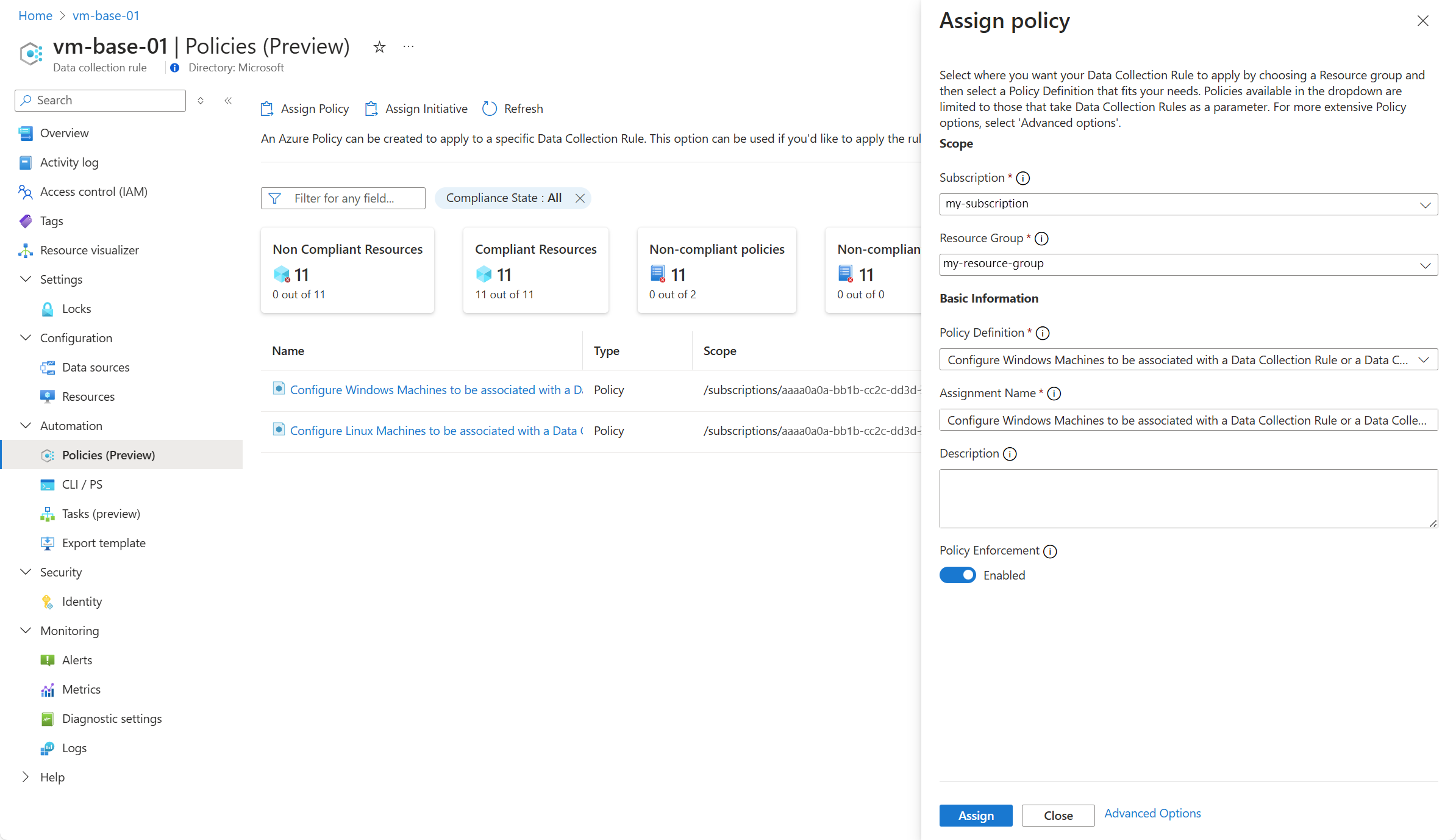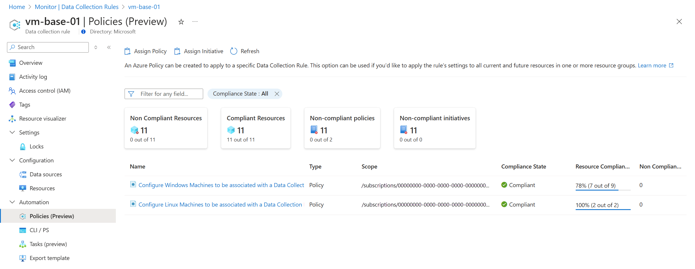 Az Azure Policy használatával több erőforráshoz is társíthat DCR-t nagy méretekben. Amikor hozzárendelést hoz létre egy erőforráscsoport és egy beépített szabályzat vagy kezdeményezés között, a rendszer társításokat hoz létre a DCR és az erőforráscsoport hozzárendelt típusú erőforrásai között, beleértve a létrehozásukkor megjelenő új erőforrásokat is. Az Azure Monitor egyszerűsített felhasználói élményt nyújt egy adott DCR-szabályzathoz vagy kezdeményezéshez tartozó hozzárendelés létrehozásához, amely alternatív módszer a hozzárendelés közvetlen Azure Policy használatával történő létrehozására.