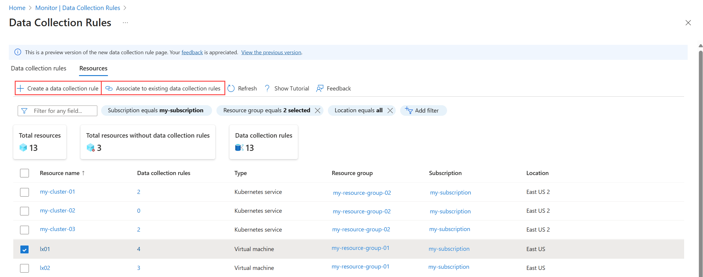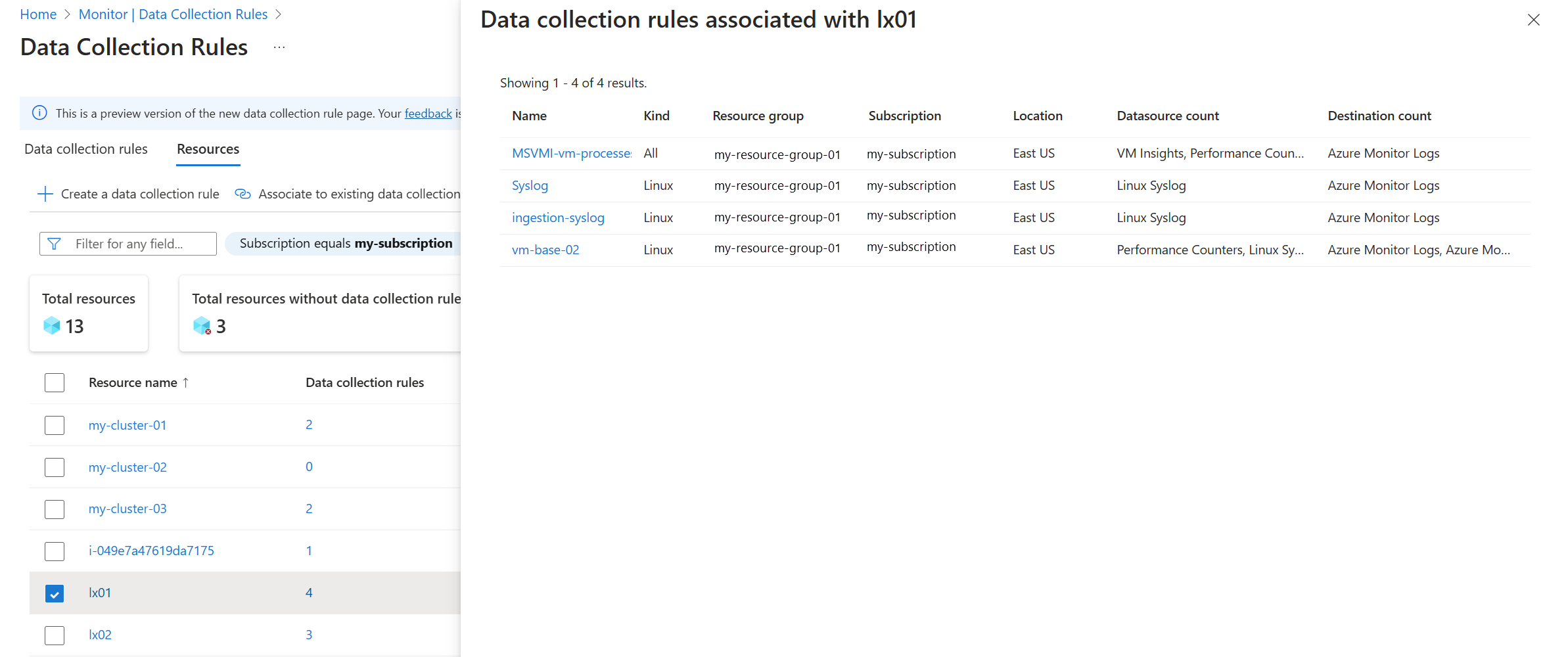 A DCR-ekhez készült új Azure Portal-felület előzetes verziója, amely összeköti a DCR-eket és a hozzájuk társított erőforrásokat. A listát megtekintheti a adatgyűjtési szabály szerint, amely megmutatja az egyes DCR-ekhez társított erőforrások számát, vagy az erőforrások szerint, amely megmutatja az egyes erőforrásokhoz társított DCR-ek számát.