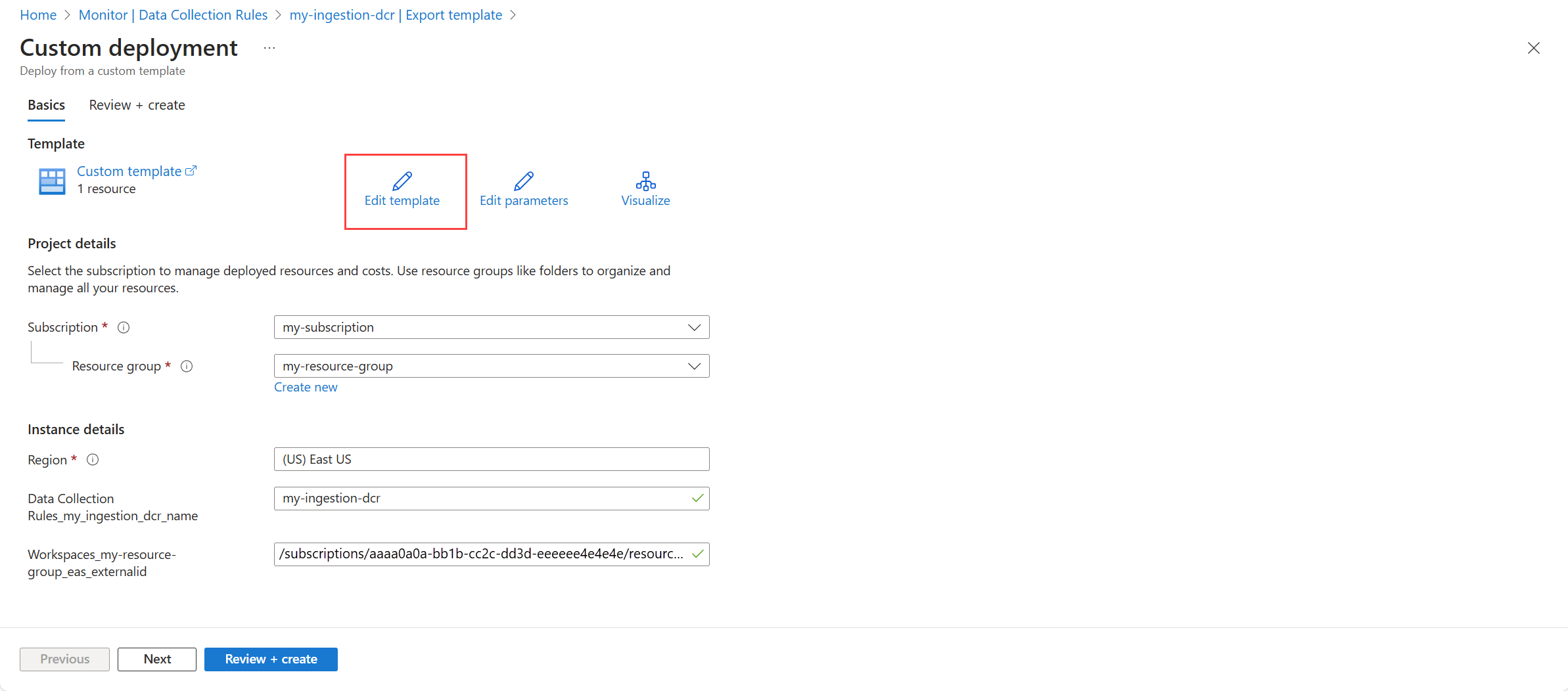 Kattintson a Sablon szerkesztése gombra a JSON szerkeszthető verziójának megnyitásához a DCR-hez. Ne módosítsa a paraméterértékeket.