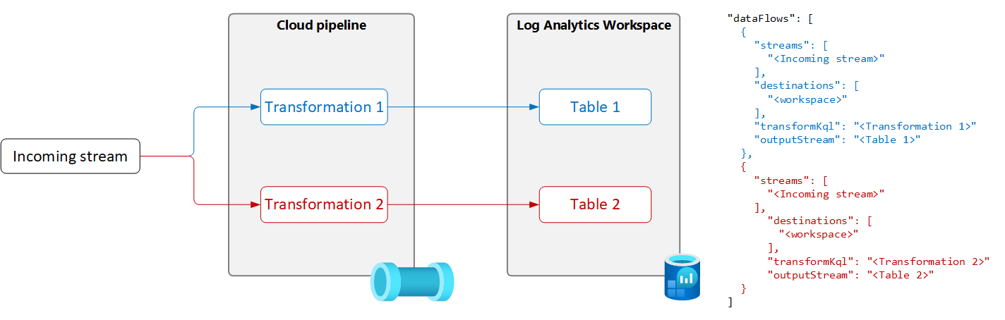 Ha egyetlen adatforrásból több táblába szeretne adatokat küldeni, hozzon létre több adatfolyamot a DCR-ben egy egyedi átalakítási lekérdezéssel és kimeneti táblával az alábbi ábrán látható módon.
