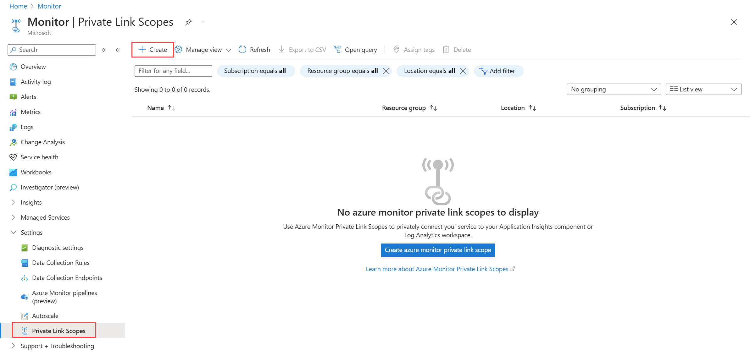 Az Azure Portal Monitor menüjében válassza a Privát kapcsolat hatókörei, majd a Létrehozás lehetőséget.