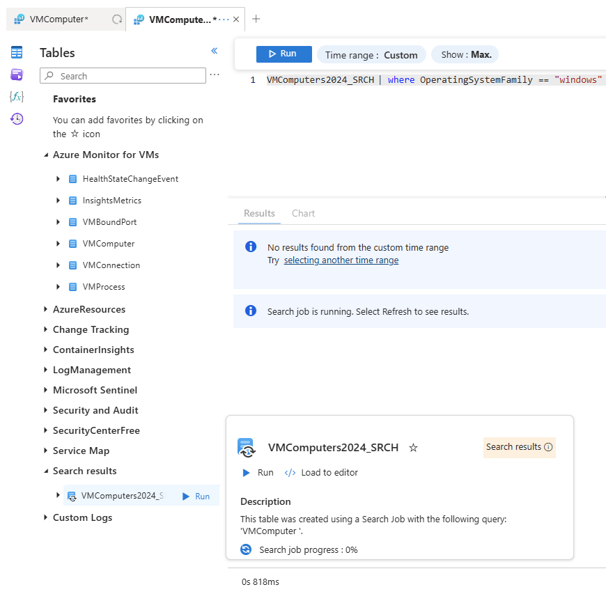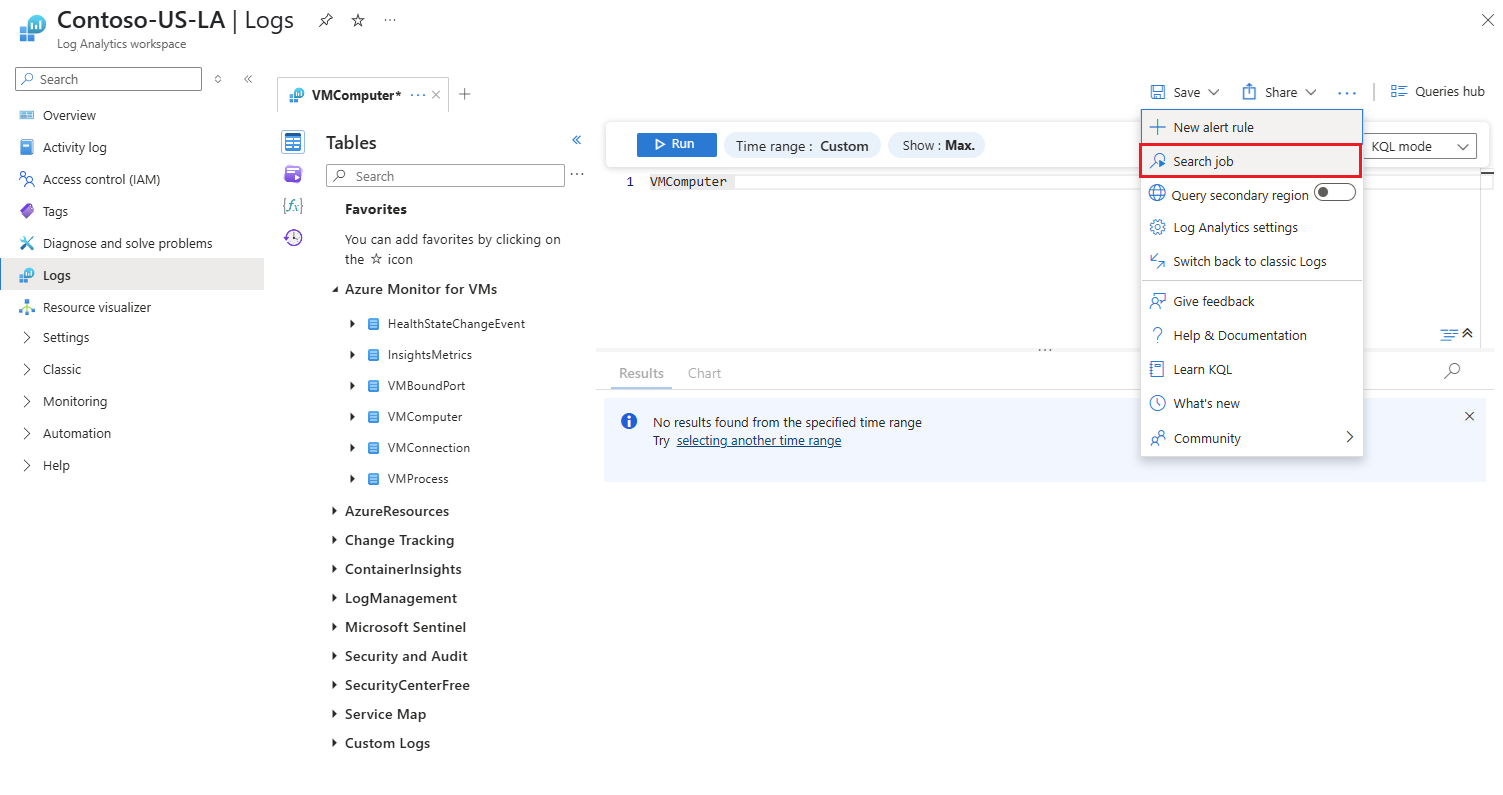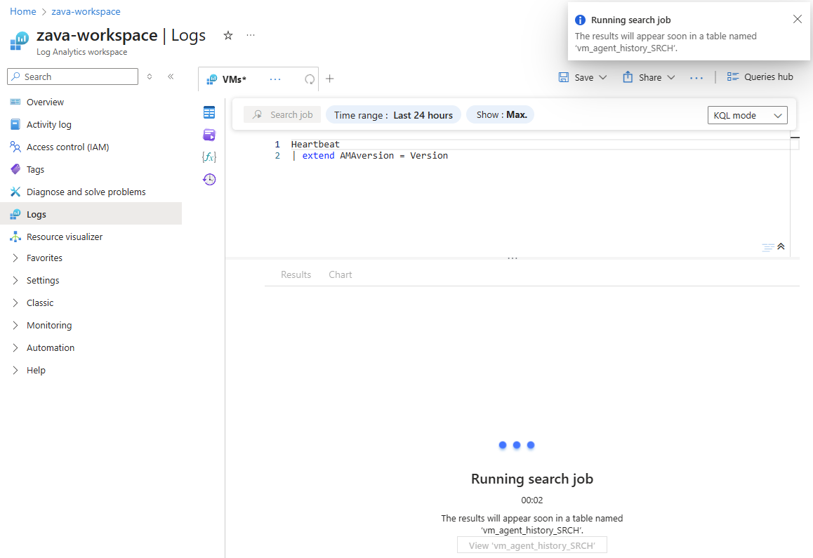 Az Azure Monitor-naplók futtatják a keresési feladatot, és létrehoznak egy új táblát a munkaterületen a keresési feladatok eredményeihez.