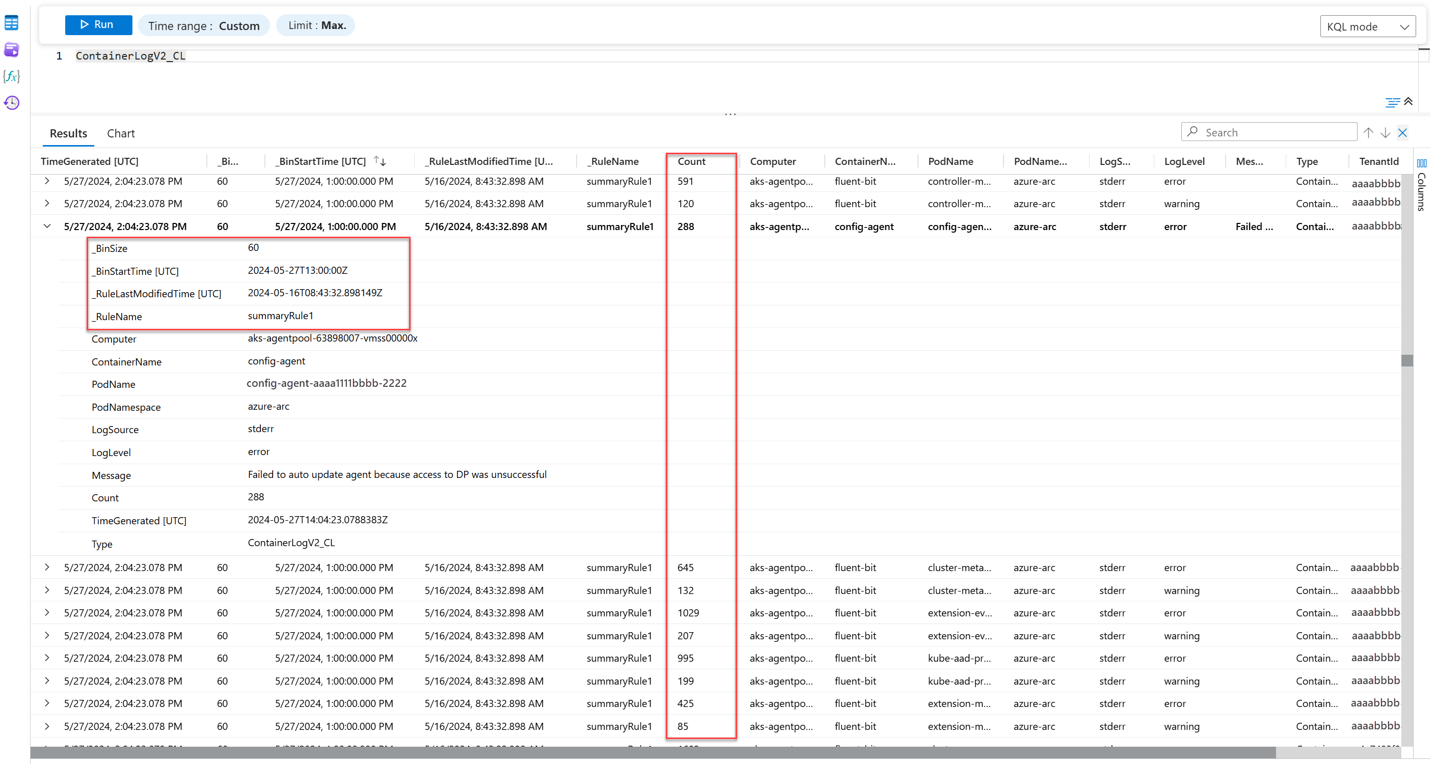 ContainerLogV2 | summarize Count = count() by Computer, ContainerName, PodName, PodNamespace, LogSource, LogLevel, Message = tostring(LogMessage.Message)