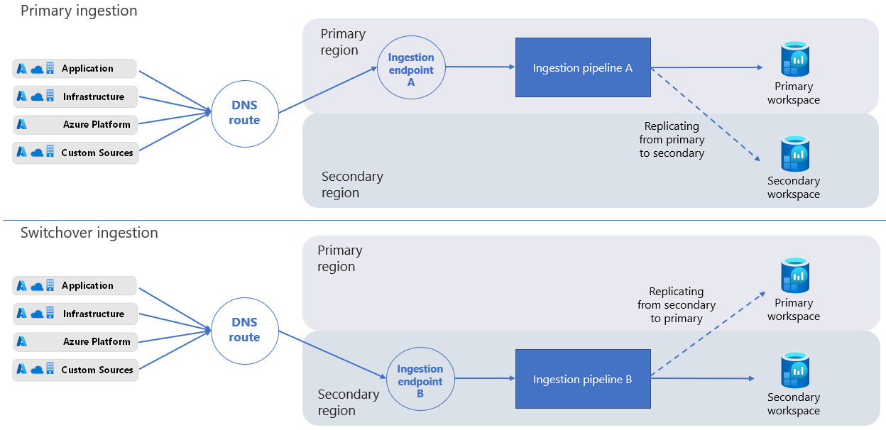 Ha egy kimaradás hatással van az elsődleges régióra, átállíthatja és átirányíthatja az összes betöltési és lekérdezési kérést a másodlagos régióba. Miután az Azure enyhíti a leállást, és az elsődleges munkaterület ismét kifogástalan állapotban van, átválthat az elsődleges régióra.