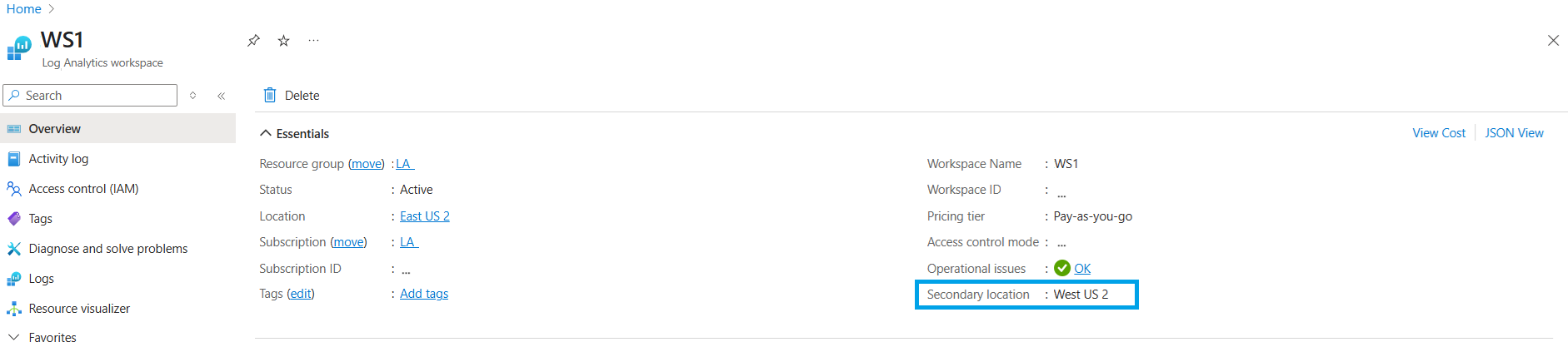 A másodlagos munkaterület egy "árnyék" munkaterület, amely csak rugalmassági célokra használható. A másodlagos munkaterület nem látható az Azure Portalon, és nem kezelheti vagy nem érheti el közvetlenül.