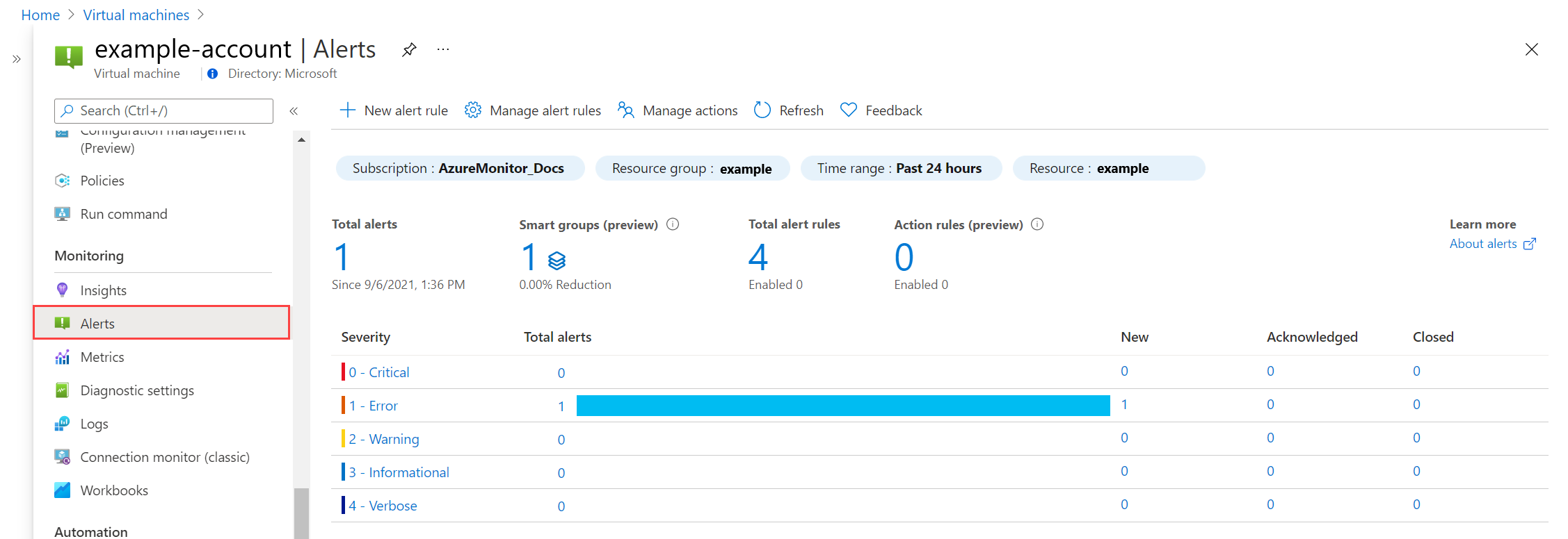 A Riasztások lapon megjelennek az erőforráshoz aktivált legutóbbi riasztások. A riasztások proaktív módon értesítik, ha fontos feltételek találhatók a figyelési adatokban, és használhatják a metrikákból vagy naplókból származó adatokat. A riasztási szabályok létrehozásáról és a riasztások megtekintéséről az Azure-erőforrás metrikariasztásának létrehozása vagy egy Azure-erőforrás naplókeresési riasztásának létrehozása című témakörben olvashat.