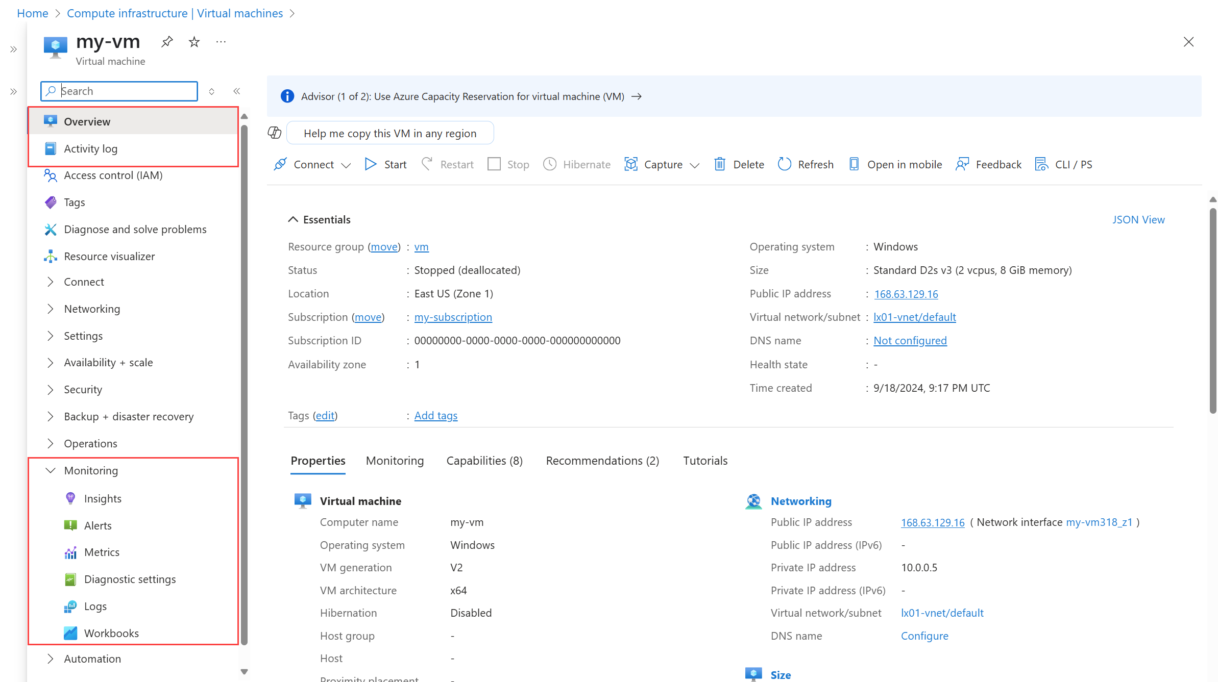 Előfordulhat, hogy a különböző Azure-szolgáltatások némileg eltérő felhasználói felülettel rendelkeznek, de a portálon közösen használnak monitorozási lehetőségeket. Ezek a menüelemek közé tartozik az Áttekintés és a Tevékenységnapló , valamint a menü Figyelés szakaszának több lehetősége is.
