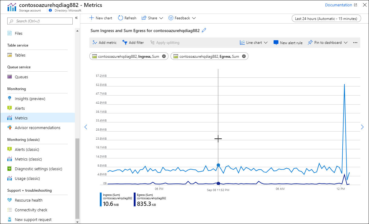 A Metrikák menüelem megnyitja a Metrics Explorert , amely lehetővé teszi az erőforrás platformmetrikáinak elemzését. Ezek olyan numerikus értékek, amelyeket a rendszer automatikusan gyűjt rendszeres időközönként, és egy adott időpontban leír egy erőforrás valamely aspektusát. Használhatja az egyes metrikákat, vagy kombinálhat több metrikát a korrelációk és trendek azonosításához. Ez ugyanaz a Metrikaböngésző, amely akkor nyílik meg, amikor kiválaszt egy diagramot az Áttekintés lapon. A Metrics Explorer használatának megismeréséhez tekintse meg az Azure-erőforrások metrikáinak elemzését ismertető témakört.