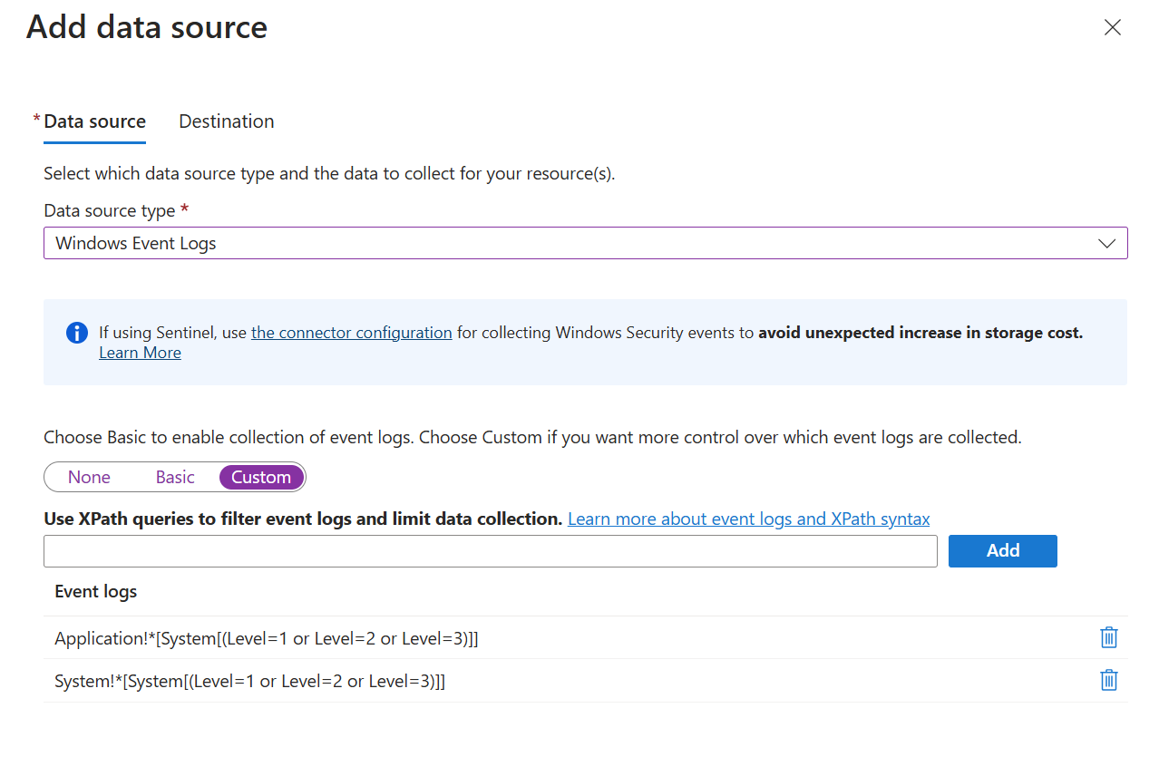 Az Azure Portal alapkonfigurációja korlátozott lehetőséget biztosít az események naplózás és súlyosság alapján történő szűrésére. Részletesebb szűrés megadásához használjon egyéni konfigurációt, és adjon meg egy XPath-t, amely csak a szükséges eseményekre szűr.