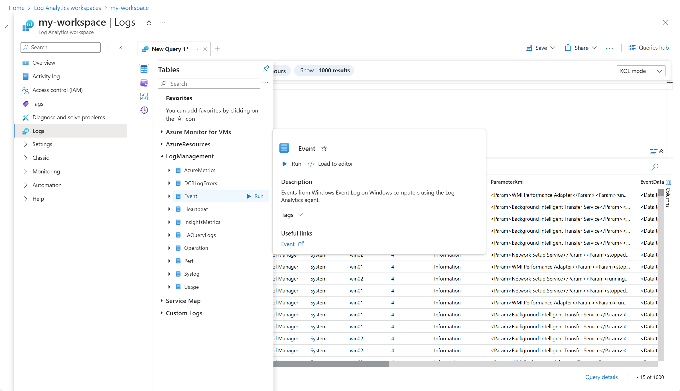 Az adatok gyűjtésének ellenőrzéséhez ellenőrizze az eseménytáblában lévő rekordokat. A virtuális gépről vagy az Azure Portal Log Analytics-munkaterületéről válassza a Naplók lehetőséget, majd kattintson a Táblák gombra. A Virtuális gépek kategória alatt kattintson az Esemény melletti Futtatás gombra.