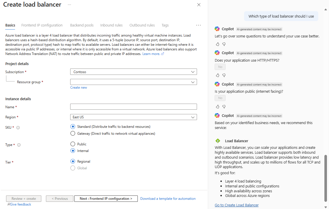 Amikor azt mondja, hogy "Milyen típusú terheléselosztót kell használnom", az Azure Copilot kérdéseket tesz fel a forgatókönyv jobb megértéséhez. Ezután javaslatot tesz, valamint egy hivatkozást a terheléselosztó létrehozásához.