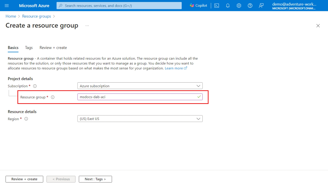 Javasoljuk az msdocs-dab-aci erőforráscsoport elnevezését. Az útmutató összes képernyőképe ezt a nevet használja.