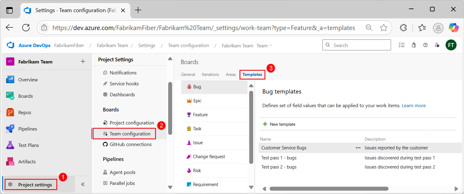 Minden munkaelemtípushoz megtekintheti és kezelheti a csapat által definiált sablonokat. Különböző műveleteket hajthat végre a sablonokon, például hozzáadhat, szerkeszthet, másolhat, törölhet vagy átnevezhet, és lekérheti a sablonra mutató hivatkozást.