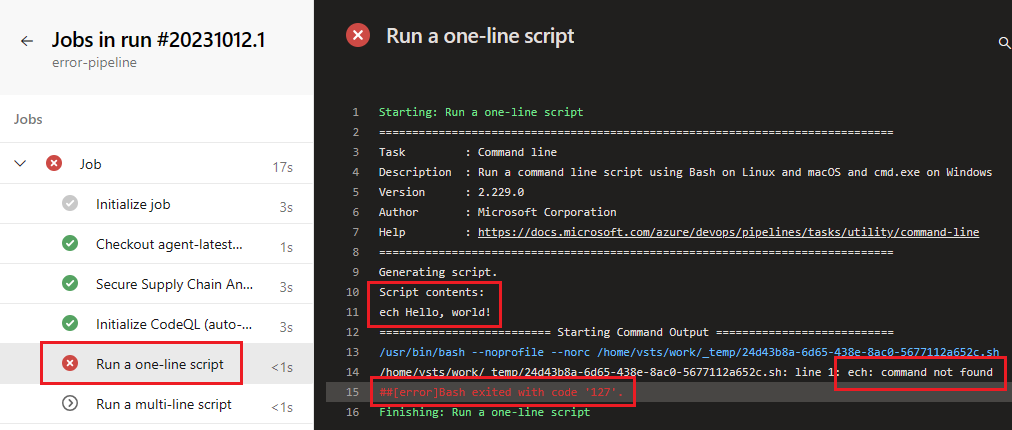 A naplók lapon látható a kijelölt hiba. Ebben a példában hiba történt a cmd-line feladatban, ahol a echo parancsot ech-ként adták meg.