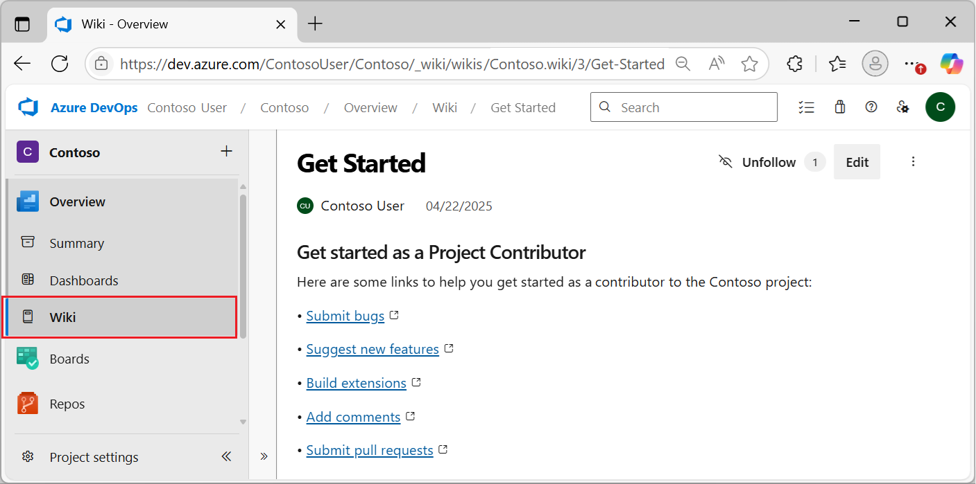 Amikor kiválasztja a Wikit az Azure DevOps webes portálján, megnyílik a wiki kezdőlapja.