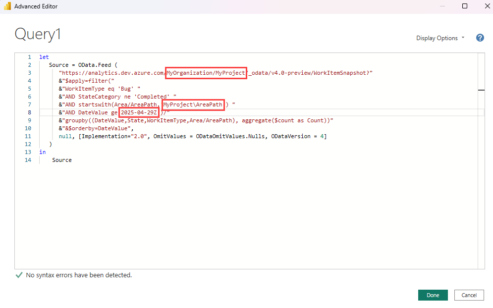 A Power BI-lekérdezéseken kívül a legtöbb mintajelentés OData-lekérdezést is biztosít. Az OData-lekérdezést külön módosíthatja és tesztelheti, mielőtt a Power BI-ban használaná. Ez a módszer nagyobb rugalmasságot biztosít, de további lépéseket is magában foglal. További információ: Csatlakozás adatokkal Power BI- és OData-lekérdezések használatával.