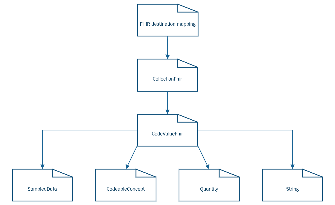 A CodeValueFhir jelenleg az egyetlen olyan sablon, amelyet az FHIR célleképezés támogat. Ez lehetővé teszi a kódok, a tényleges időszak és a megfigyelés értékének meghatározását. Több értéktípus támogatott: SampledData, CodeableConcept, Quantity és String. A konfigurálható értékekkel együtt a rendszer automatikusan kezeli a megfigyelési erőforrás azonosítót, valamint a megfelelő eszköz- és betegerőforrásokhoz való csatolást.