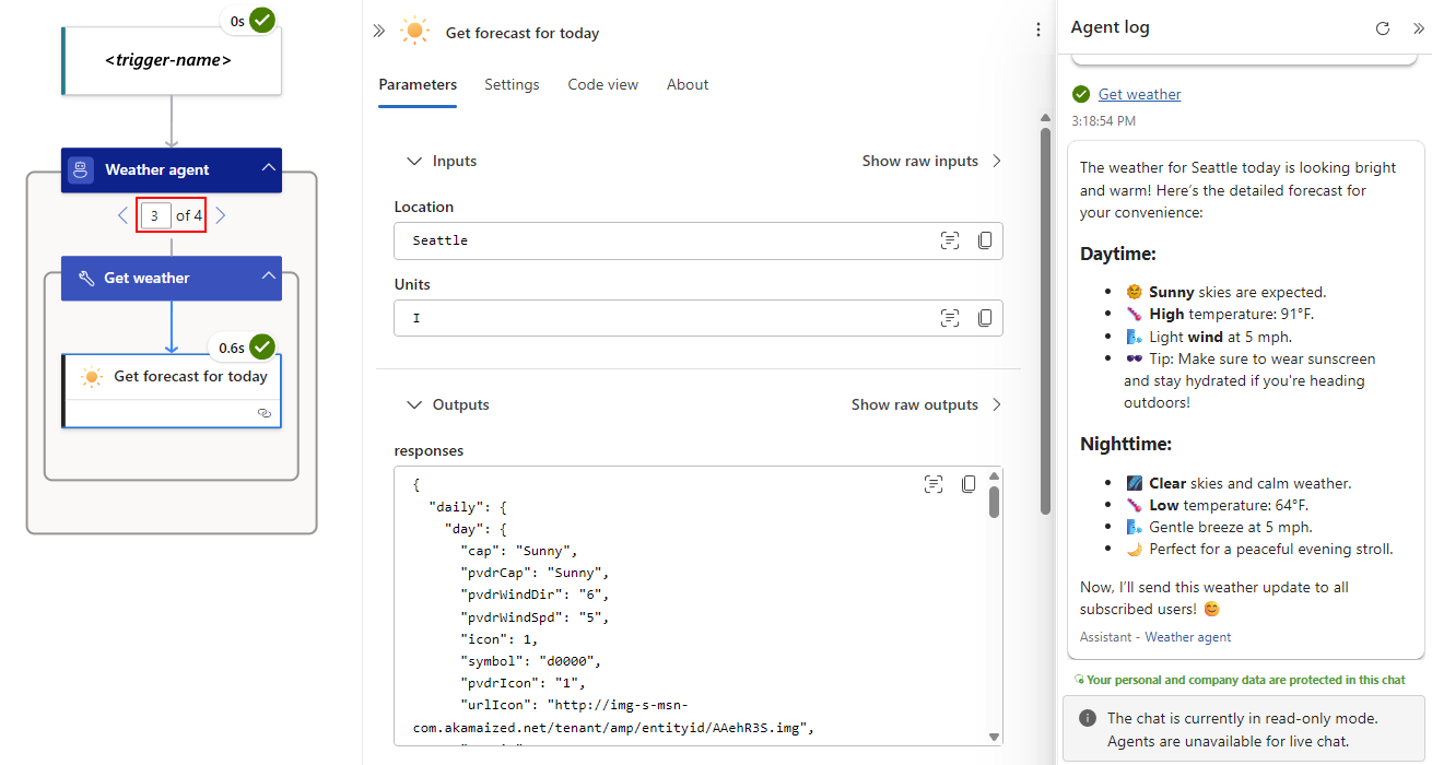 Megnyílik a figyelési nézet, és megjeleníti a munkafolyamat-műveleteket az állapotukkal. Az Ügynöknapló panel meg van nyitva, és megjeleníti a korábban megadott ügynöki ciklusutasításokat. A panelen az ügynökhurok válasza is látható.