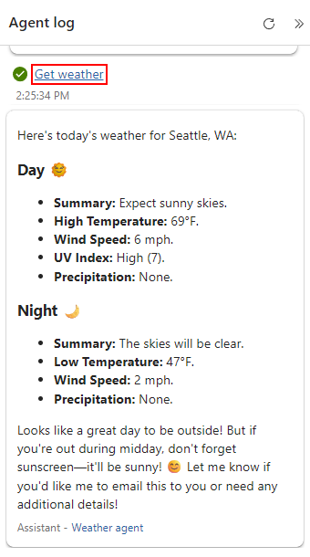 Get the weather for the specified location.A Leírás területen az Ügynökparaméterek szakasz csak adott használati esetekre vonatkozik. További információ: Ügynökparaméterek létrehozása.