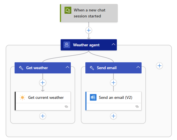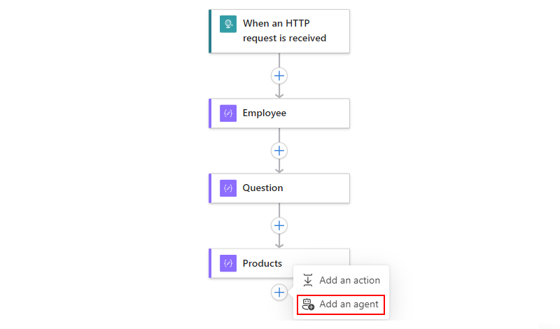 A tervezőben az ügynökműveletben a meglévő eszköz mellett válassza a pluszjelet (+) a művelet hozzáadásához.