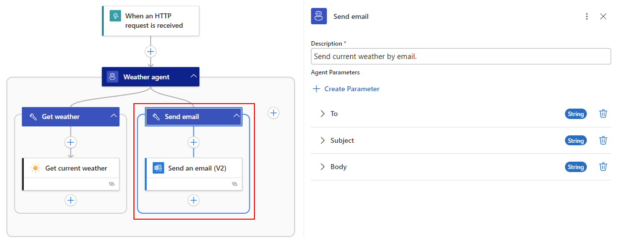 Az e-mail küldése (V2) műveletben az ügynökparaméterek létrehozásához kövesse a korábbi általános lépéseket.