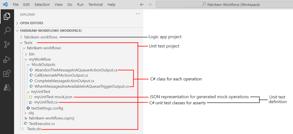 Az Explorer ablakban megjelenik egy Tesztek nevű új projektmappa a logikai alkalmazás projektmappájában. A Tesztek mappa a következő mappákat és fájlokat tartalmazza: