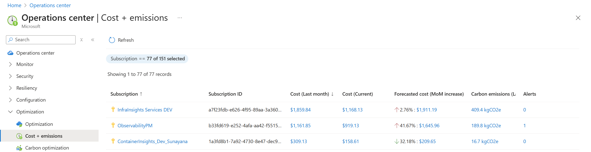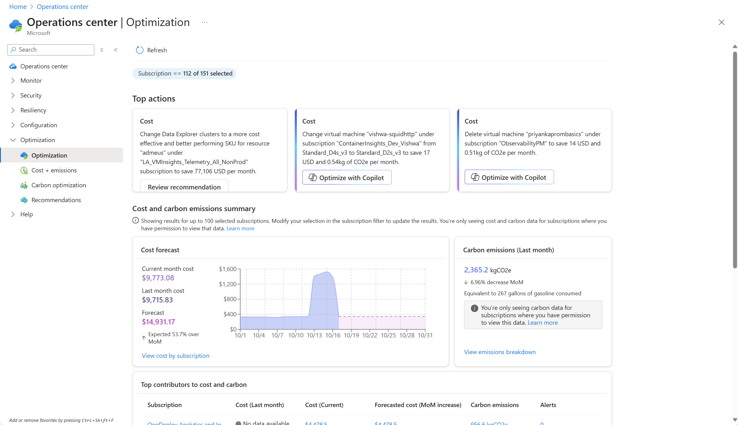 Az Operations CenterOptimalizálási menüje segít azonosítani az Azure-erőforrások költséghatékonyságának és szén-dioxid-kibocsátásának javítására szolgáló lehetőségeket. Az ajánlott eljárásokon és használati mintákon alapuló elemzéseket és javaslatokat nyújt, és az Optimalizálási ügynök segítségével proaktív javaslatokat és irányított segítséget nyújt.