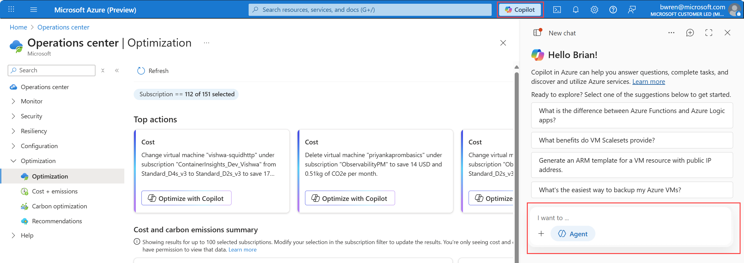 Az Operations Center optimalizálási ügynöke ügynöki élményt nyújt a költségmegtakarítási és szén-dioxid-csökkentési intézkedések azonosításához és implementálásához. Az ügynök az Azure Copilot használatával elemzi az erőforrás-használati mintákat, és műveleteket javasol az Azure-környezet optimalizálásához. Kezdeményezhet beszélgetést az ügynökkel az üzenetekkel, vagy konkrét javaslatokat is kiválaszthat az irányított segítségkéréshez.