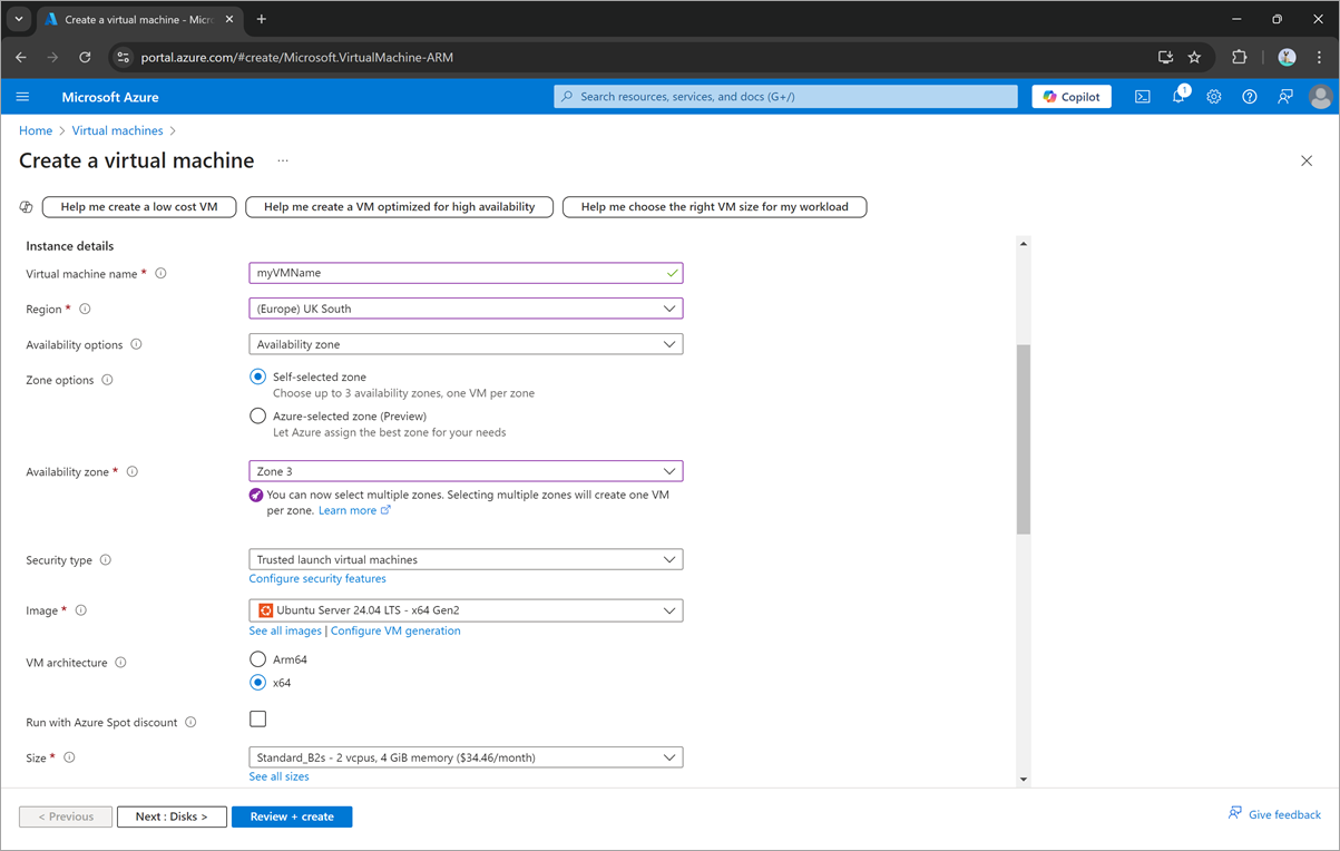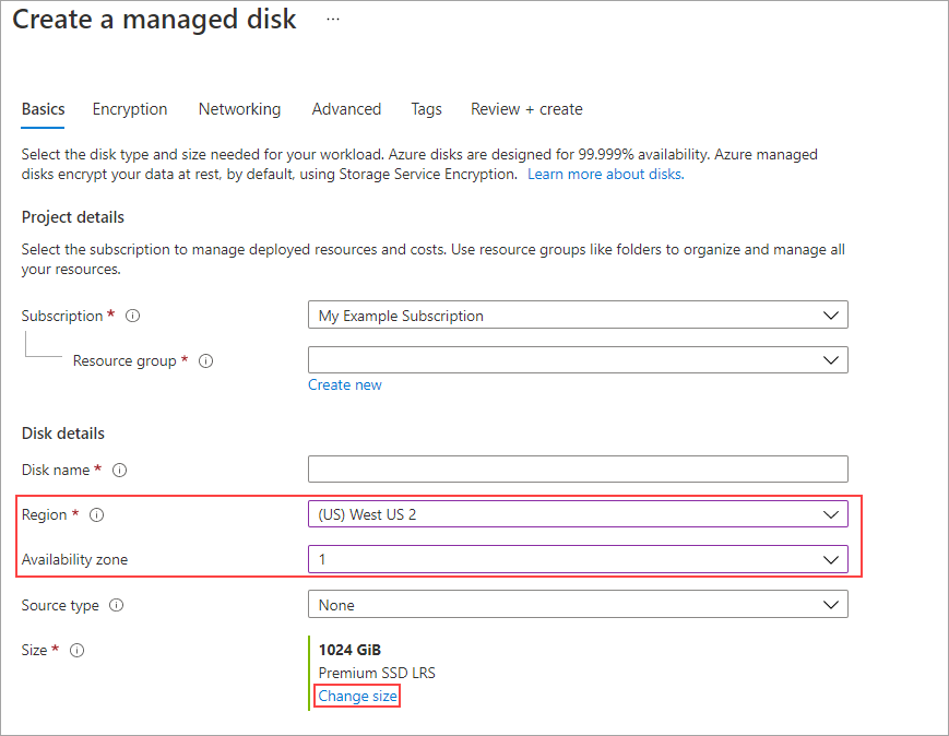 Válasszon ki egy olyan régiót, amely támogatja az Ultra Disks szolgáltatást, és válasszon ki egy rendelkezésre állási zónát, töltse ki a többi értéket a kívánt módon.