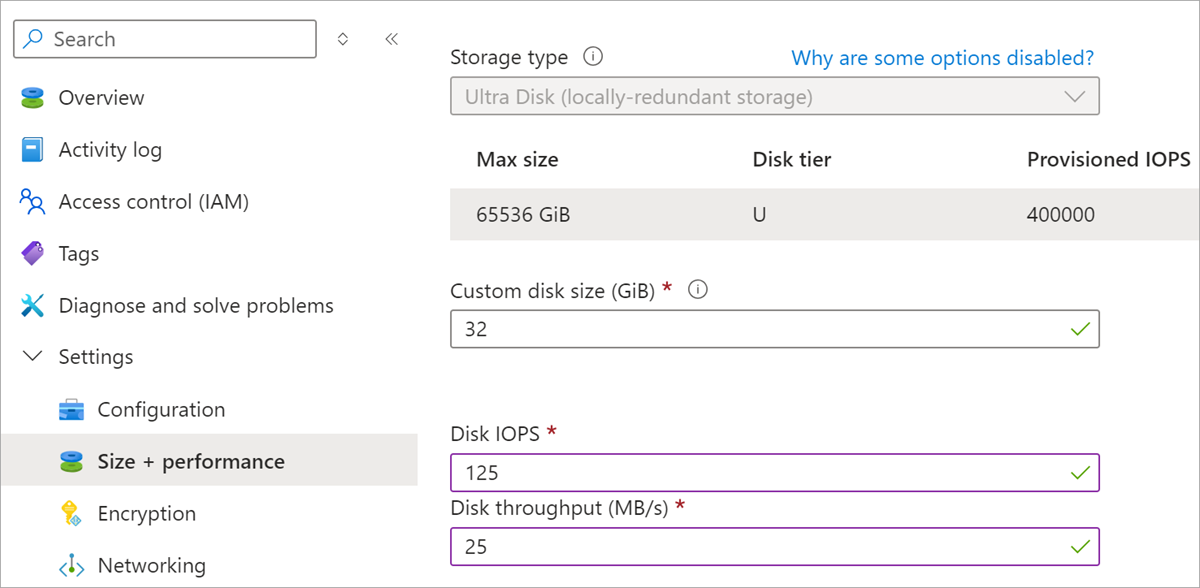 - Csak az egységes vezénylési móddal rendelkező virtuálisgép-méretezési csoportokkal való üzembe helyezés során: Az egységes virtuálisgép-méretezési csoportokkal használt Ultra Disk-lemezek különböző képleteket használnak az IOPS-hoz és az átviteli sebességhez a teljesítményükhöz. A képletek korlátainak túllépése üzembe helyezési hibát eredményez. Az üzembe helyezés sikeressége után növelheti ezeknek a lemezeknek a teljesítményét . A részletekért tekintse meg az Ultra Disk IOPS és az Ultra Disk átviteli sebességét .